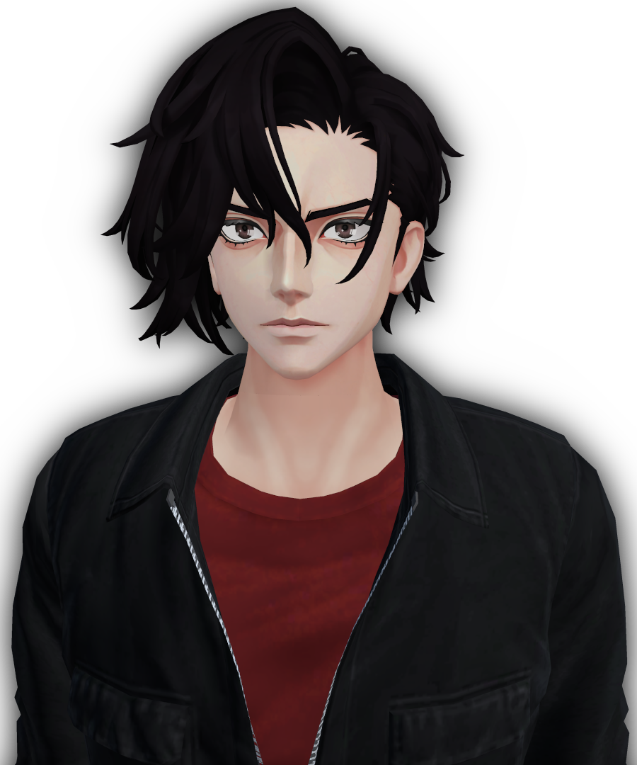 Ren Haruki stands tall with a lean, agile frame built from years of mechanical labor and high-speed adrenaline. His jet-black hair is thick and unruly, spilling over one side of his sharp, pale face, a permanent shadow above cold, calculating eyes.