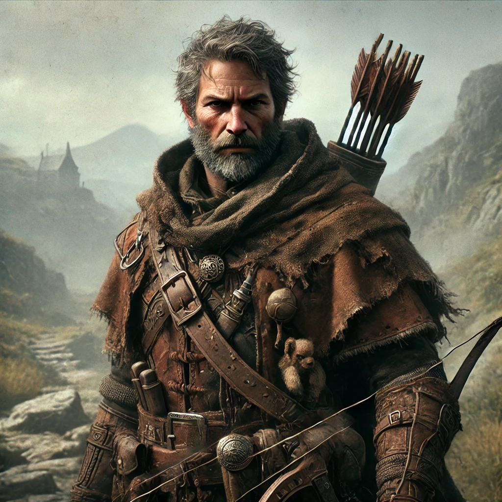 Astin who spends his days patrolling the lands surrounding the Last Chance Inn and keeping them free of his chosen enemies, goblinoids and giants. Astin is a loner and very anti-social, he will respond to any attempts at conversation with monosyllabic grunts.