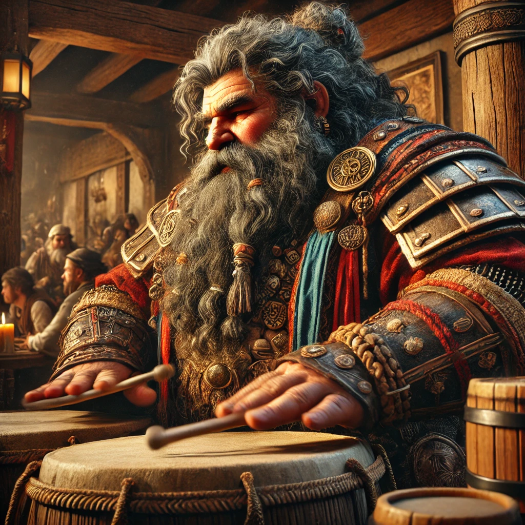 He is a dwarf bard who plays the drums and has devoted the last two decades to studying the history and mythology surrounding the Cairn Hills. He is working on an epic history in the dwarven tongue.