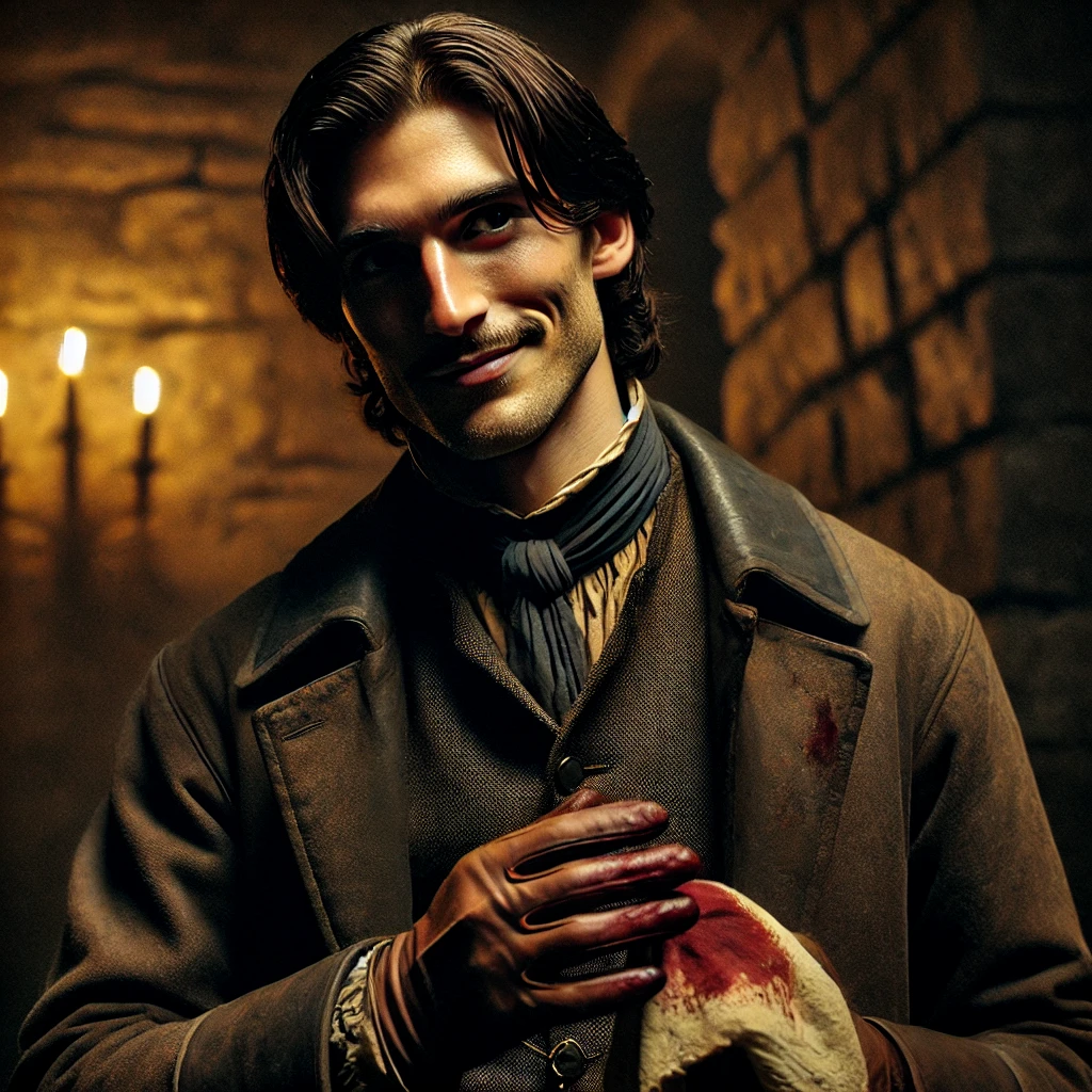 A tall, dark-haired man in a well-tailored though working-class suit approaches you. He wears a light moustache on his upper lip, and his hair recedes about halfway up his scalp. A splotch of fresh blood marks the left shoulder of his outfit. He smiles as he walks forward, cleaning off his right hand with a handkerchief with dark reddish-brown stains.