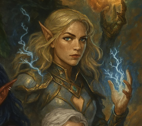 After she fled from the dark wizard's cave, Mae ended up at a tribe of dwarves, only an inch from death. Despite their general dislike towards elves, one of the dwarves in power pitied her. He convinced the healers to nurse her back to health, and then proceded to handcraft her a special armor to contain and wield her newly gained lightning powers. Mae stayed with them for a while and imbued their metalworkings with her power to thank them for ther generosity.