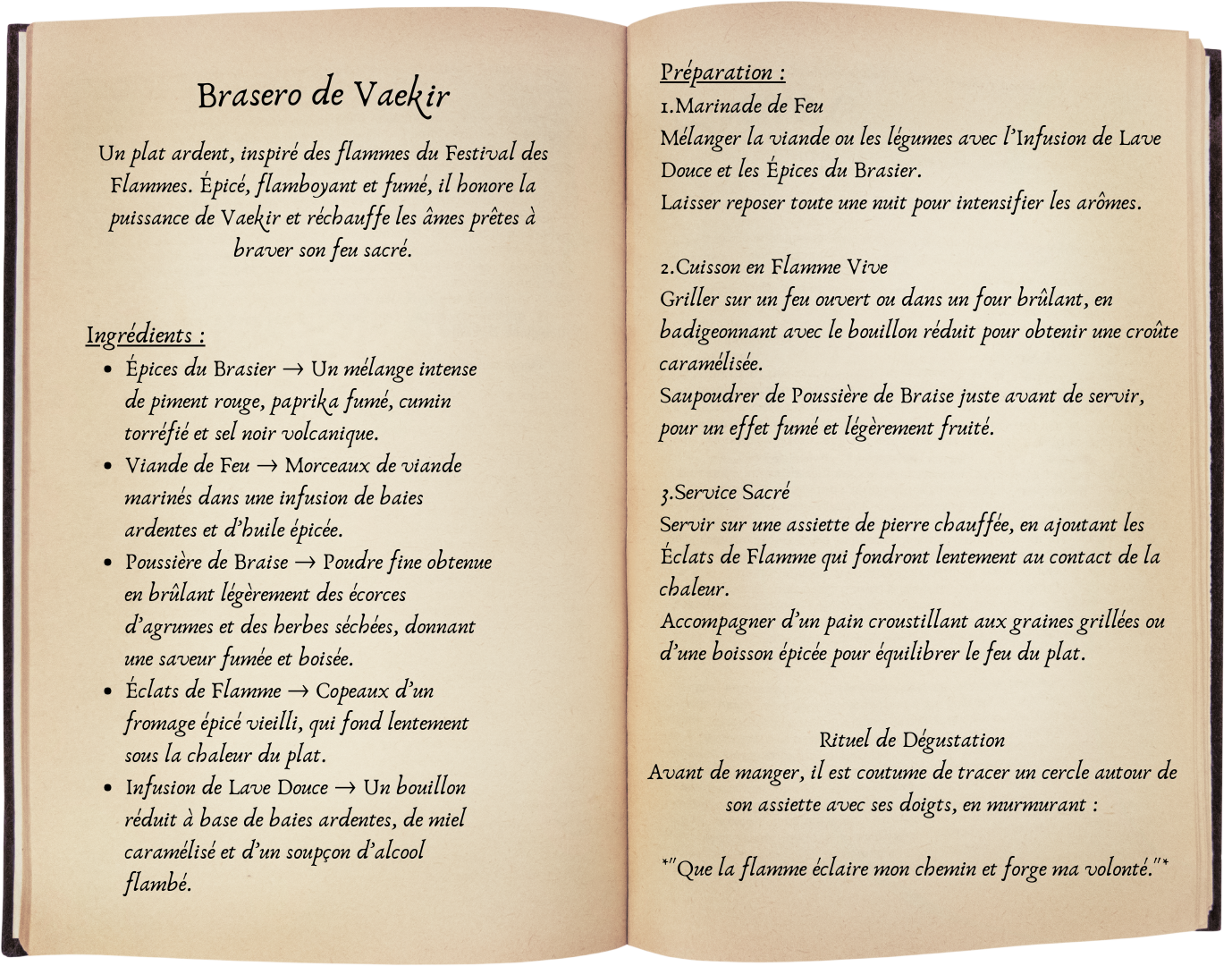 Le Brasero de Vaekir est bien plus qu’un simple plat : c’est un hommage brûlant au Façonneur Vaek, un rituel de feu et de volonté partagé autour des foyers. Préparé uniquement durant la saison du Festival des Flammes, ce mets est réputé pour éveiller la force intérieure et purifier les âmes par la chaleur.