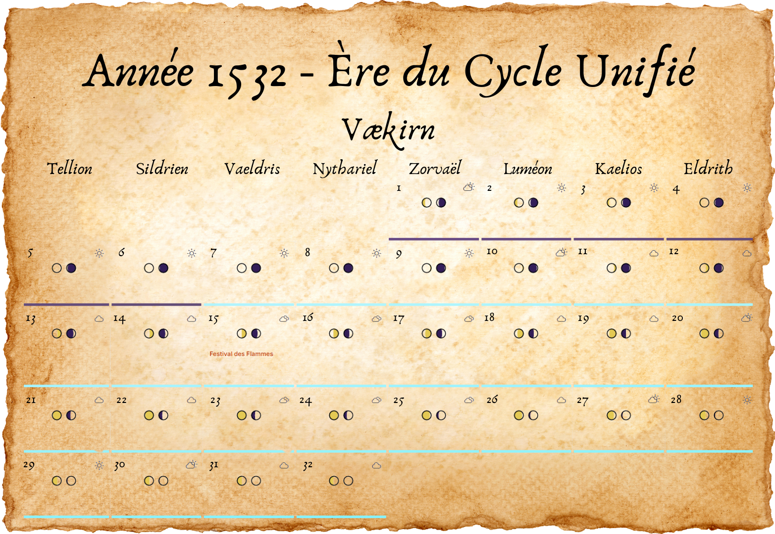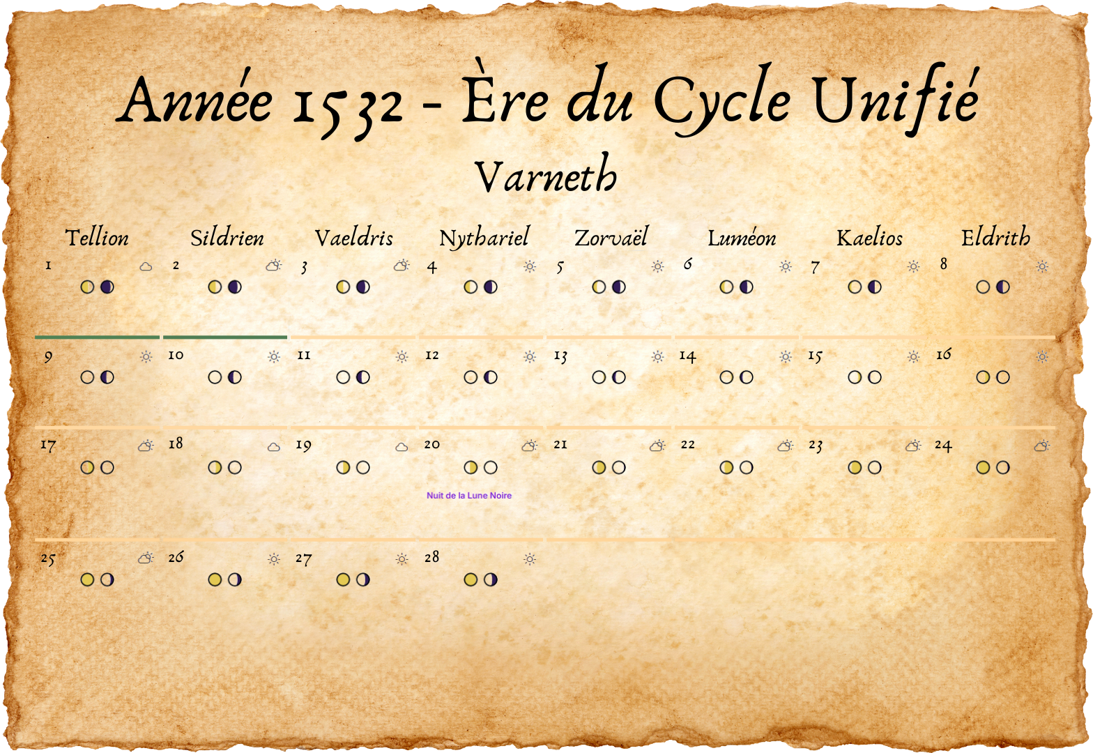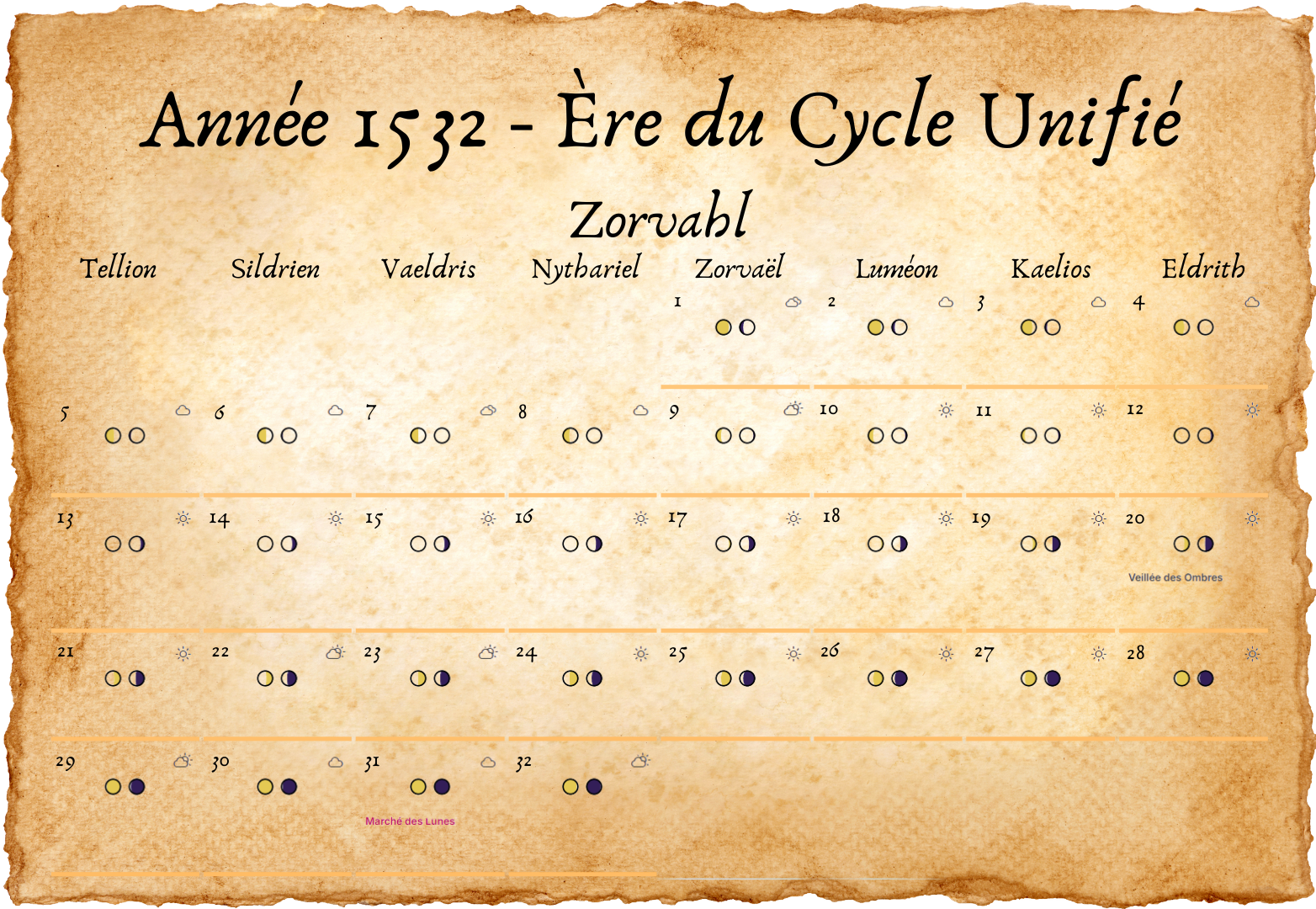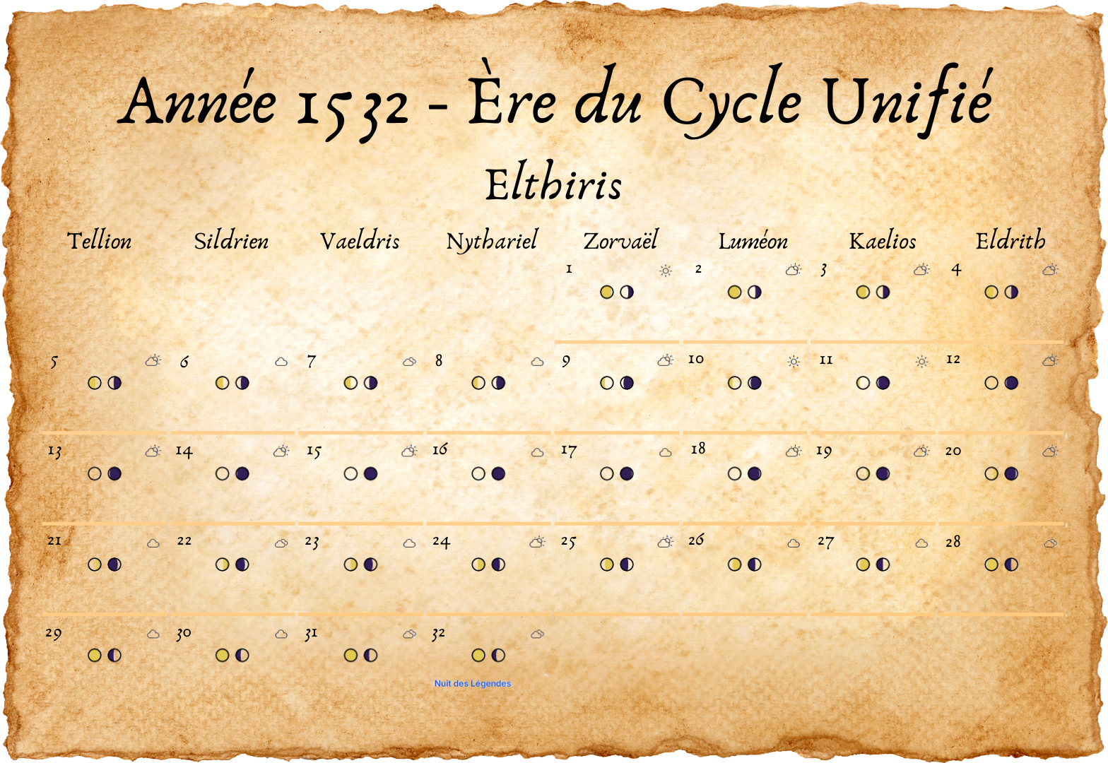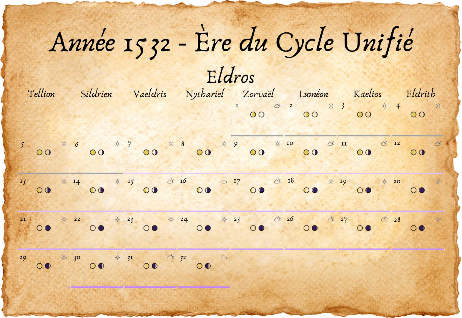 - Tous les deux ans, un 33e jour est ajouté à Eldros, pour compenser les légères irrégularités des cycles lunaires.