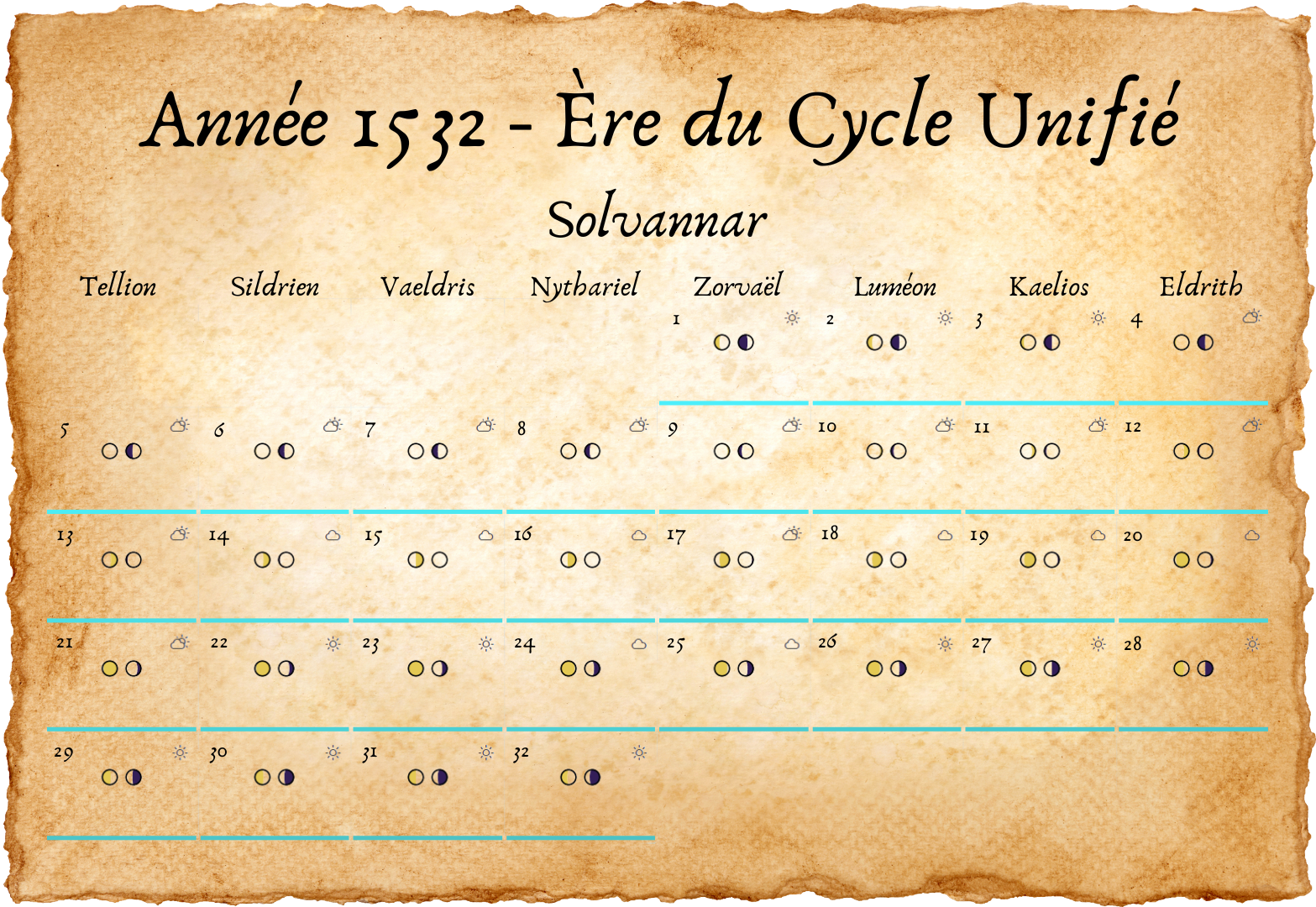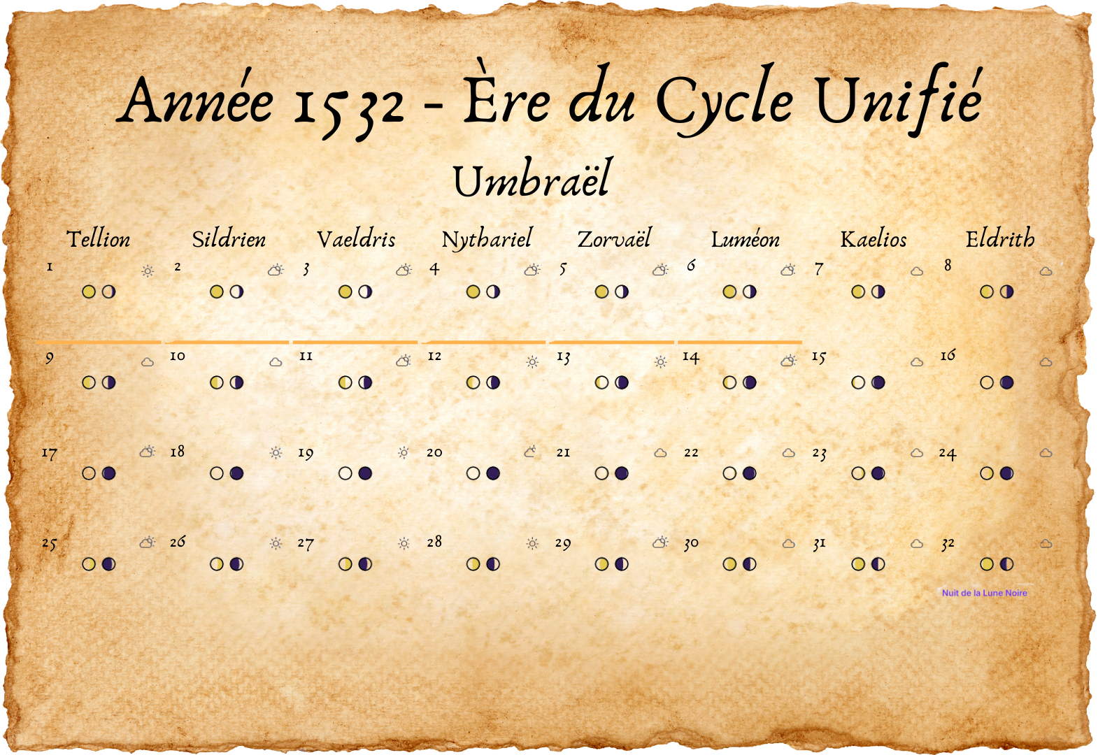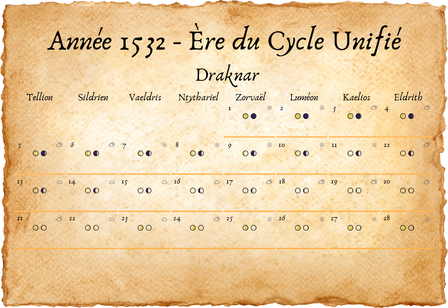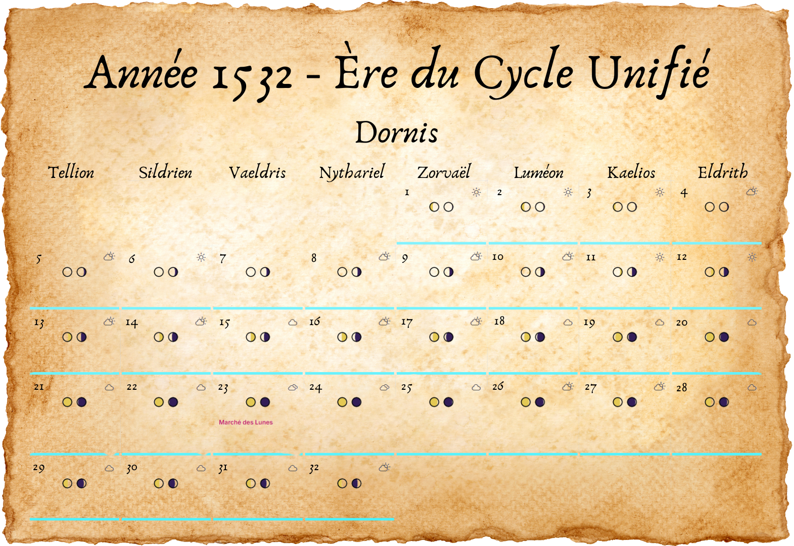 - Tous les deux ans, un 33e jour est ajouté à Eldros, pour compenser les légères irrégularités des cycles lunaires.