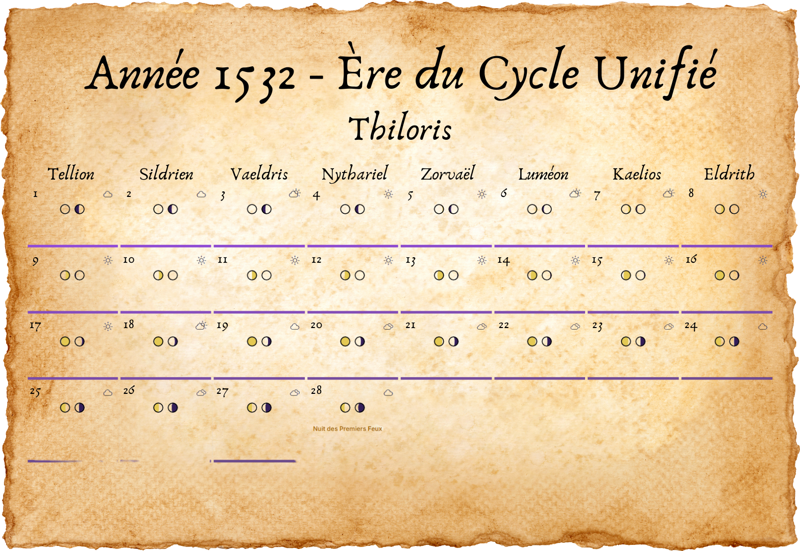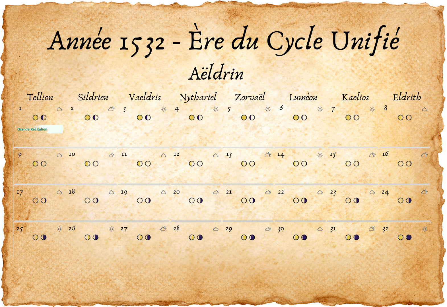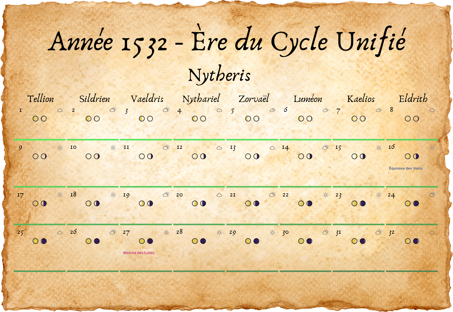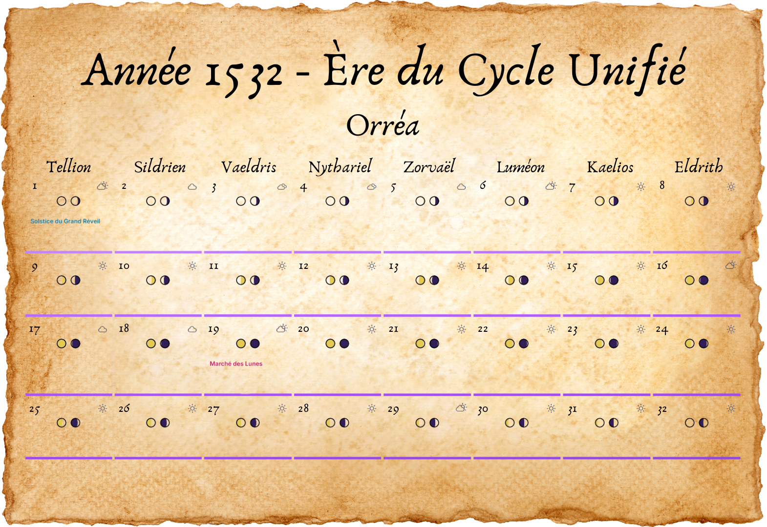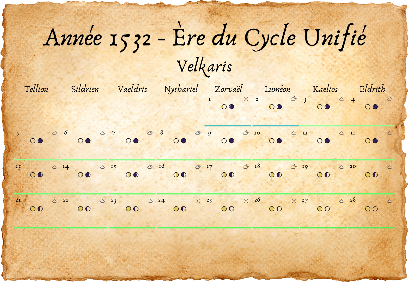 - Tous les deux ans, un 33e jour est ajouté à Eldros, pour compenser les légères irrégularités des cycles lunaires.