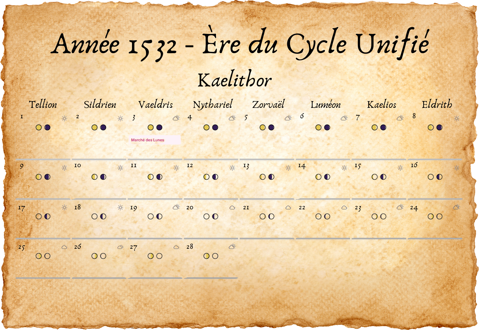 - Les événements surnaturels, tels que les tempêtes arcaniques ou les perturbations élémentaires, suivent les phases des lunes.