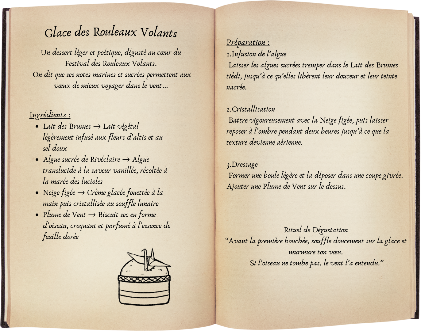 La glace des Rouleaux Volants est un met incontournable, souvent servit en dessert dans les restaurants durant le Festival Des Rouleaux Volants, mais aussi dans les rues par des petits marchands pour une dizaine de Lumes. Au même titre que les habitants laissent leurs fenêtres ouvertes pour laisser Nhyara purifier leur maison, manger cette glace aurait le même effet sur le corps selon les croyances.