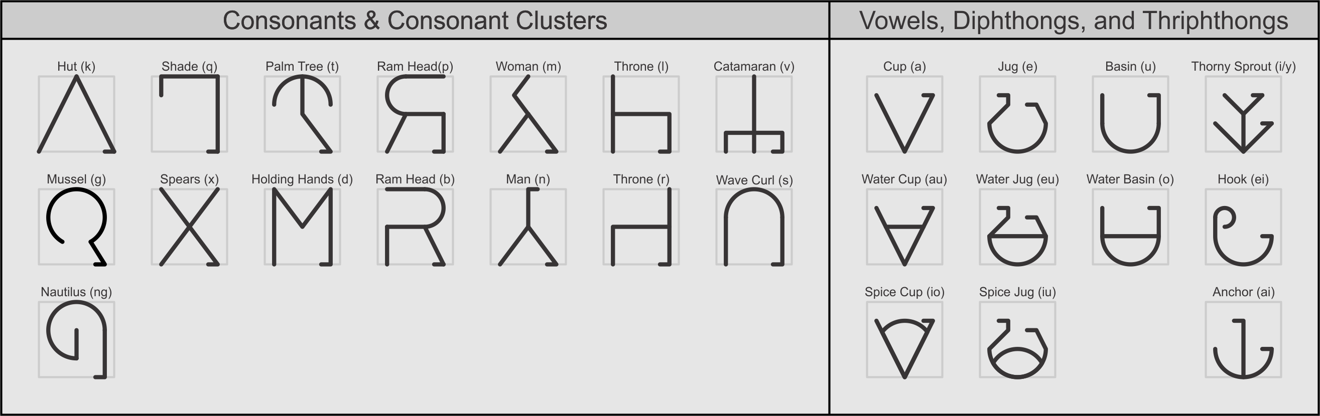 The alphabet of Iuxataba. Also known as the 'Eiqa Adiuxataba' - meaning 'The Spirit-Script's Substance' - or the 'Kaqata' for the first three sounds in the alphabetical order. The grey outlines demonstrates the relative size of the letters and the typical empty space (kerning) between them.Iuxataba, the written form of Iuxat, is an alphabet, though a few characters code for dipthongs, tripthongs, or consonant clusters. It is read left-to-right, then top-to-bottom. Word breaks are indicated by spaces. While sentence breaks are often indicated with a space, vertical bar, and another space in machine-generated text, written, artistic, and official writing often encloses sentences in rectangular boxes.