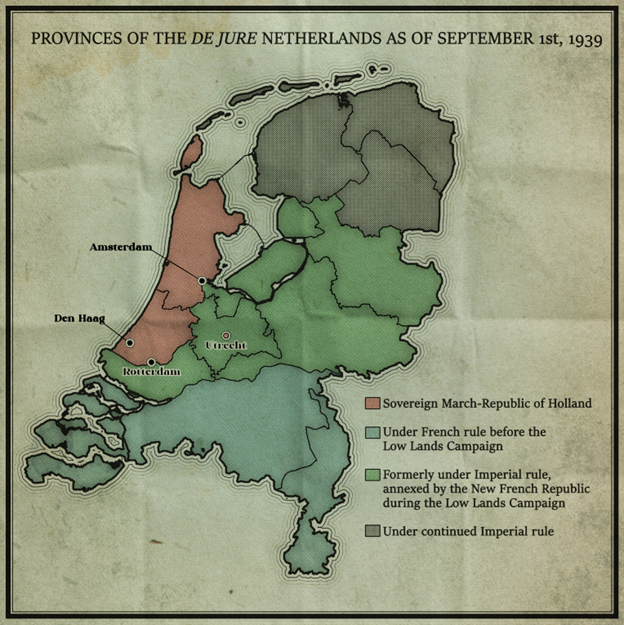And turn into dissent it did. More numerous than estimated were those who had been waiting for the façade to crack. Previously unorganized Communist movements, low-profile Imperial conformists, sympathizers to British Coalists, and otherwise anti-monarchist voices suddenly rose from the political landscape. Worse yet: after a few months of isolation due to the French invasion (and following prior ideological differences), the Dutch provinces outside Holland were now nearly a lost cause. Abandoned politically and militarily, they were about to fall victims to French opportunism. As for Friesland, which thus far retained some potential to remain united with Holland, it had become an easy target for Imperial propaganda; stressing that their Stadhouder seemed content with the fate of Holland alone and implying her disdain of other regions helped to tip the political scales and secure the province to the Empire.