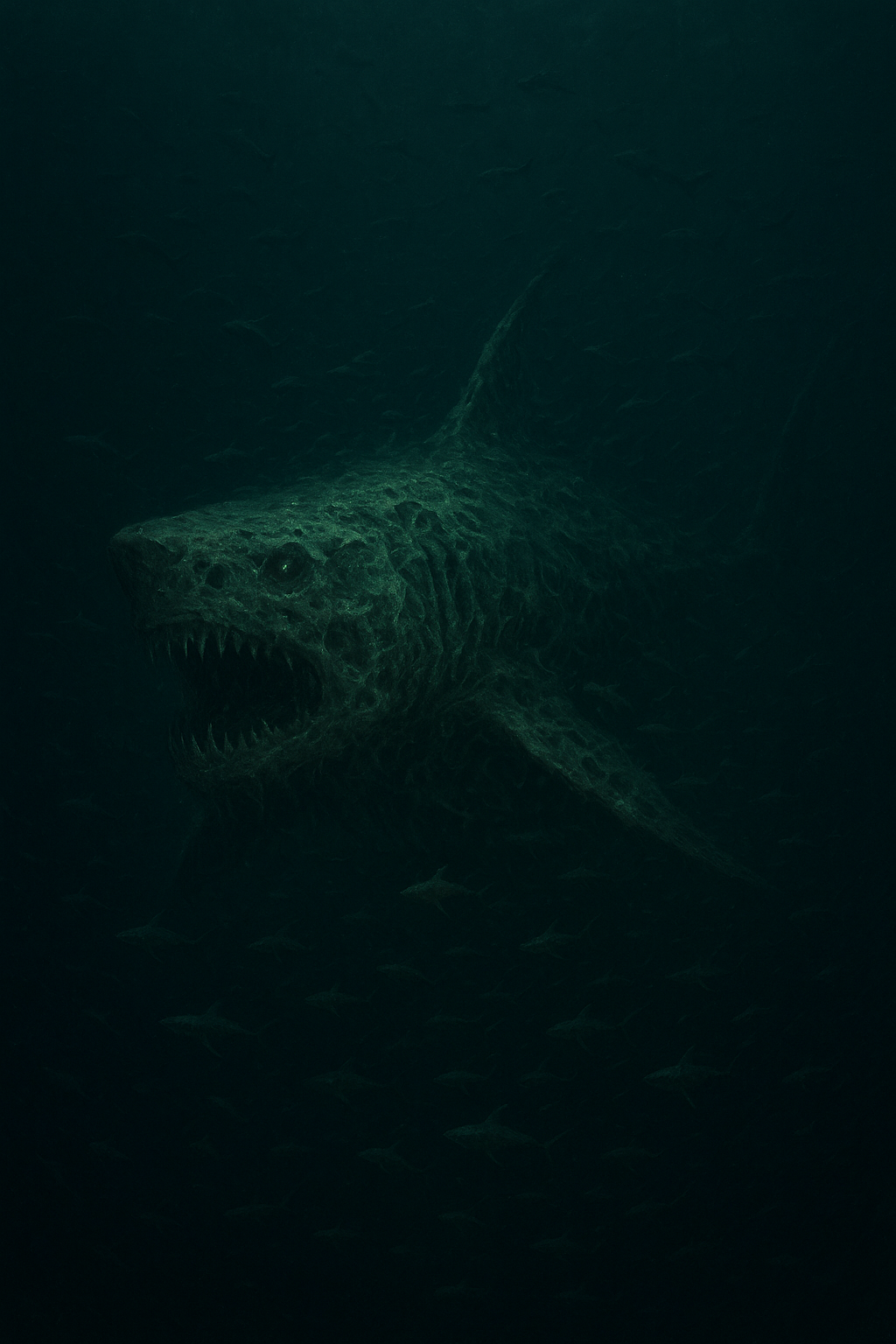 The Dread Maw is a monstrous undead shark over three hundred meters long, composed of luminous necrotic flesh that constantly tears and regenerates. Thousands of sharks both living and undead move in a perpetual swarm around and within it, slipping through exposed bone and rotted cavities as if the creature were a drifting fortress. Each shark is bound entirely to its will. The Dread Maw commands its minions with telepathic clarity and can order them to attack, scout, or detonate themselves in devastating bursts of bone and gore. Despite its decayed form, the leviathan retains an eerie calm intelligence and a cold, calculating mind.