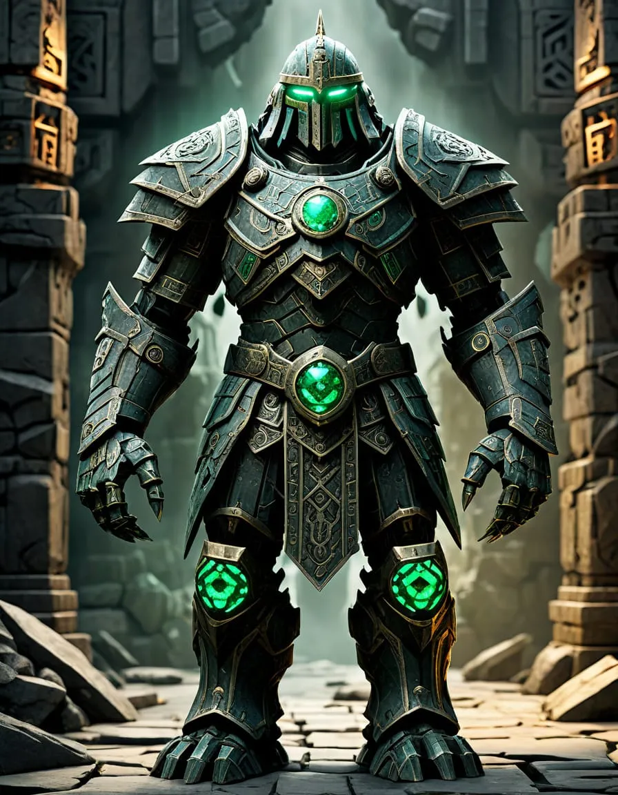 Castor’s construct body stands over ten feet tall, carved from dark, veined stone reinforced with bronze inlays. Emerald light seeps from the seams of his armor-like plating. His head is sculpted into an angular helm-like visage, with a single vertical emerald “eye” that glows brighter when he is agitated.