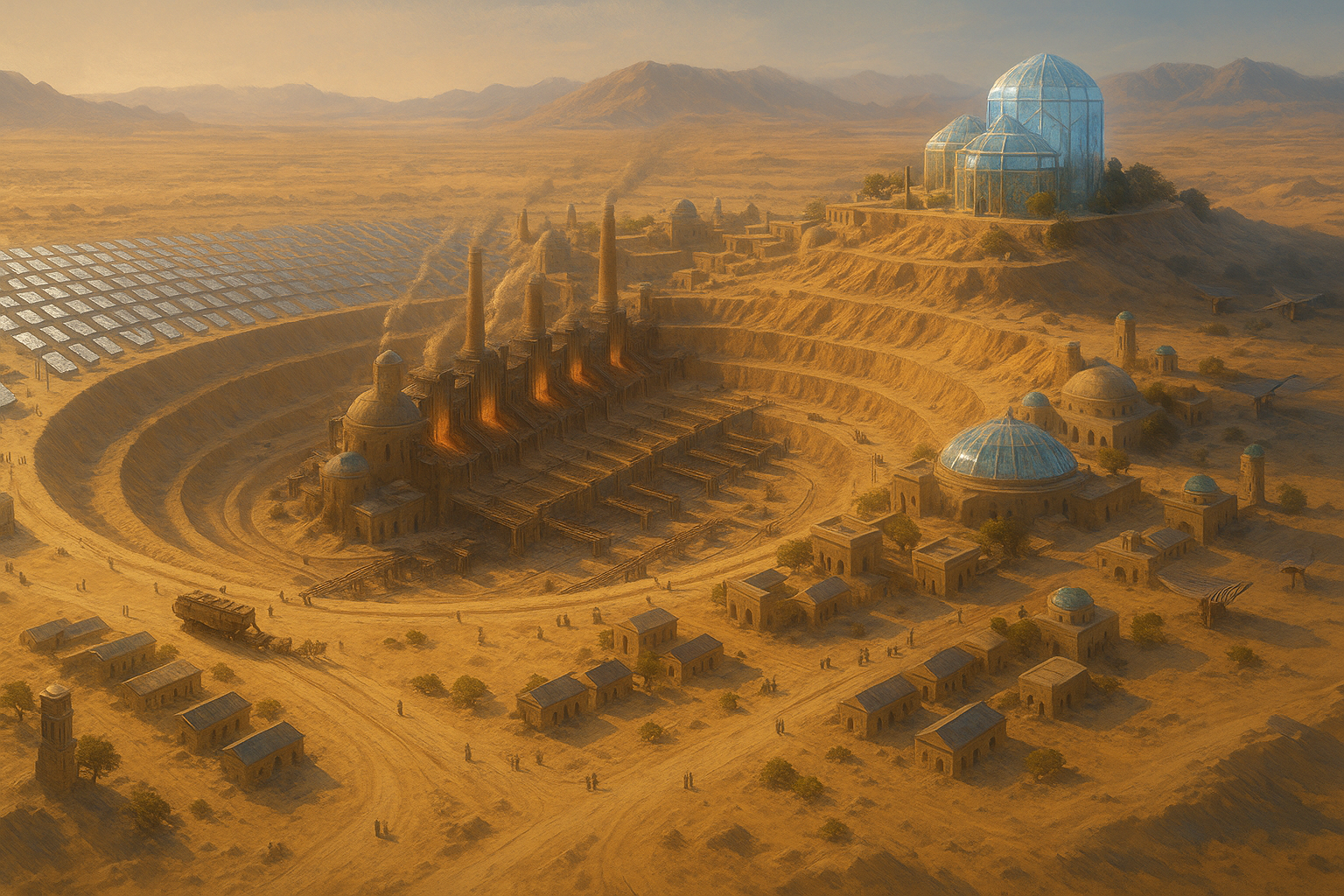 - Energy Mix: Primary heat from heliostat mirror arrays (clear days backup char kilns for night/overcast; waste-heat recovery drives shop forges and bath heating.