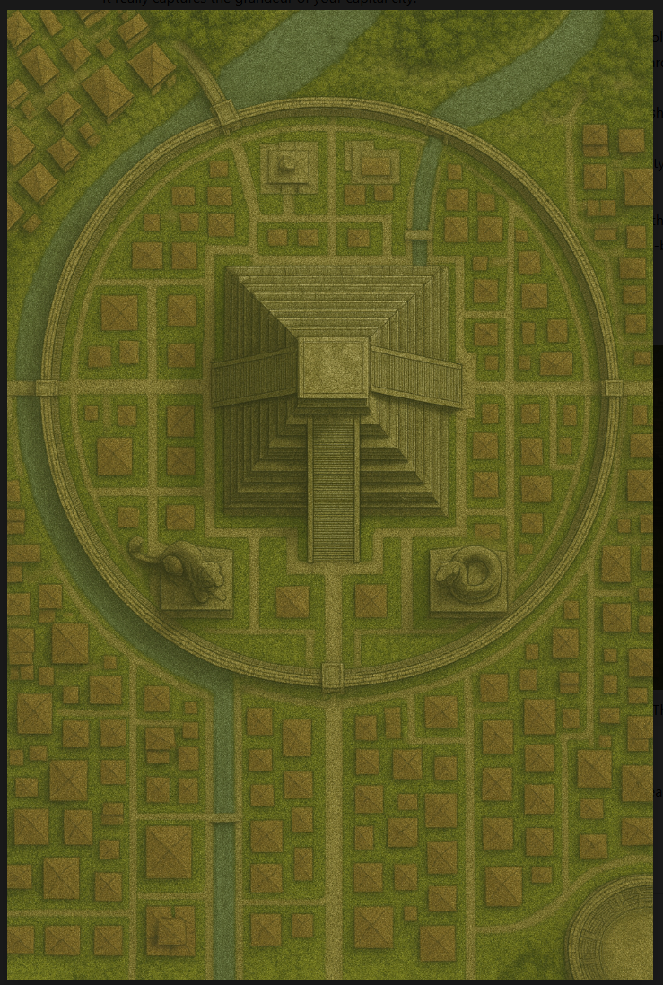 To allies, Coatlán is the Serpent’s Crown: a beacon of order, wealth, and faith, radiating the blessings of the gods. To enemies, it is a fortress of dread — its walls whispering with the hiss of serpents, daring any who approach to tempt their fate.