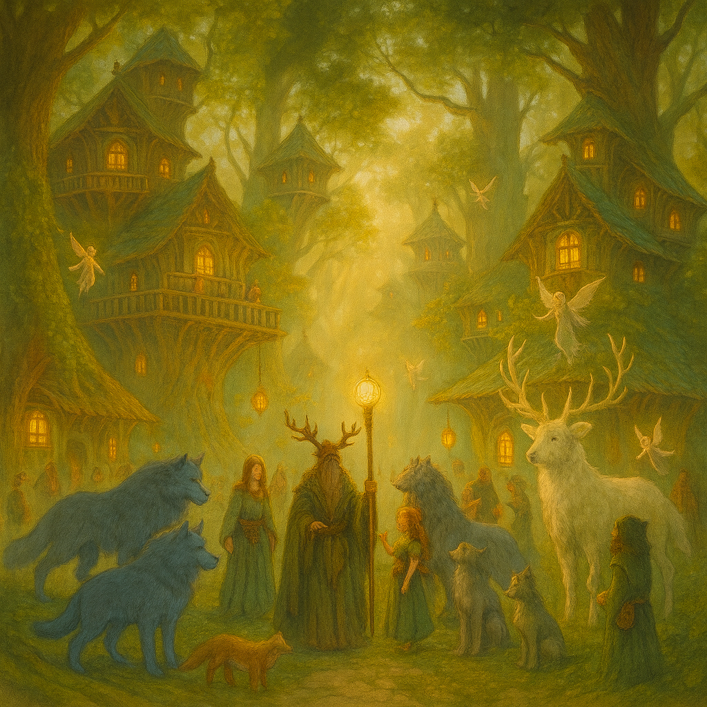 Atmosphere with Habitants: Walking through Druemorra feels like stepping into a living myth. Mortals barter beside druids in antlered crowns; wolfborn laugh with children; fae slip through markets with whispers like bells. Animals prowl freely, yet no one fears them — for here, the city and the wild are one.