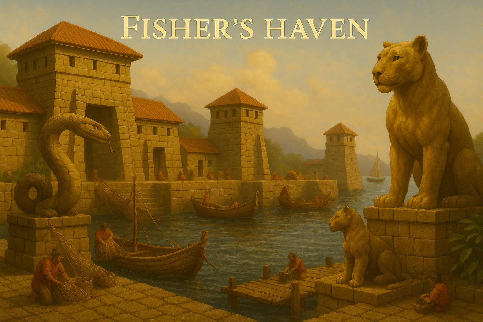 Set along the gentle curve of Dajjashi’s coast, Fisher’s Haven is a settlement where stone and sea live in harmony. The harbor walls rise with watchtowers capped in red-tiled roofs, guiding vessels through mist and tide. Flanking the entrance are monumental carvings: a serpent coiled in vigilance, and lions crouched in eternal readiness. To outsiders they are statues, but to the fisherfolk, they are living guardians — bound by prophecy to Queen Eztli’s reign.