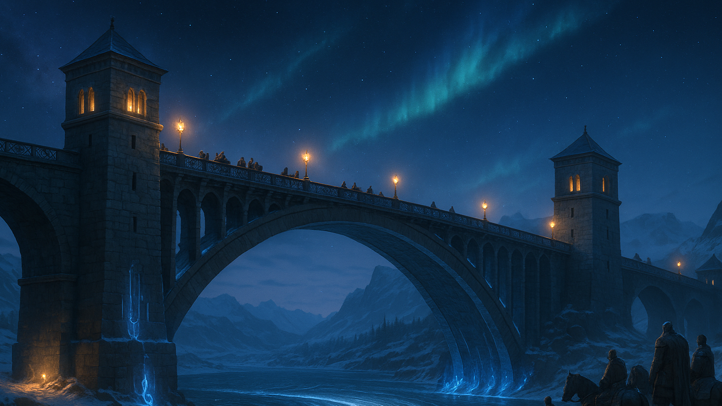 The Greatbridge of the Paleflame Accord crowns the First Fork where the Coldfire divides and the realms of Arya and Dravis face one another. It is a tri-material marvel—stone, metal, and rune-ice—raised by shared will, craft, and pact. The bridge anchors trade, diplomacy, and defense across one of the world’s most lethal natural barriers.