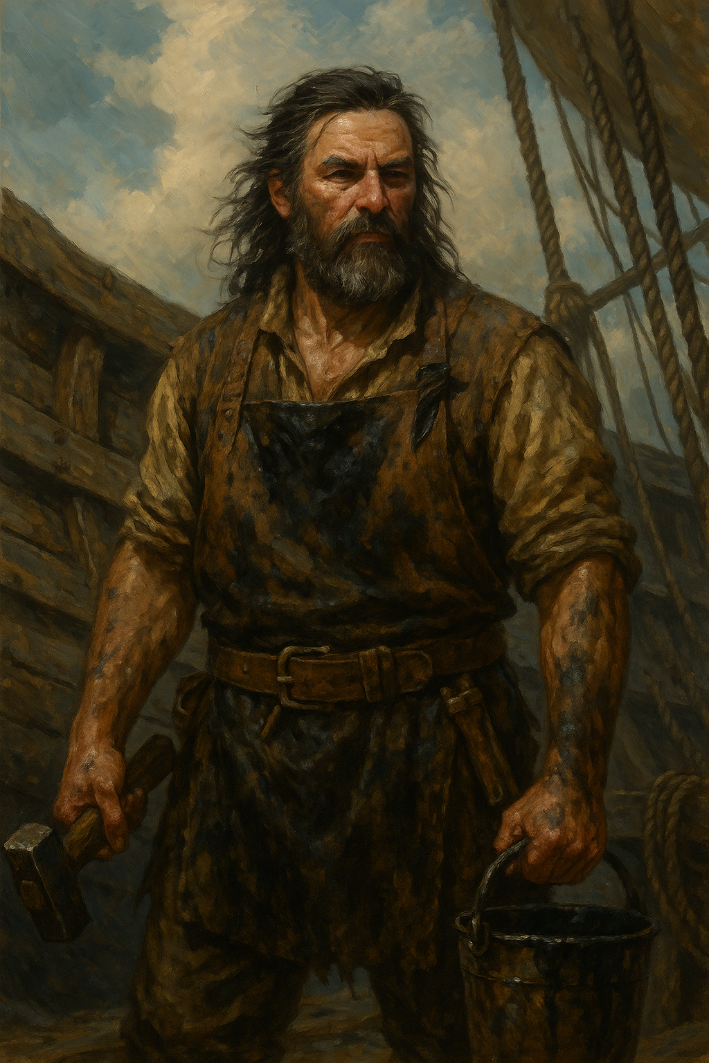 He’s tall but stooped from decades bent over keels and beams, his back broad enough to bear a mast and his hands thick with callus and burn. His skin is wind-leathered, pocked with old splinters, and always smells faintly of tar and oak oil.