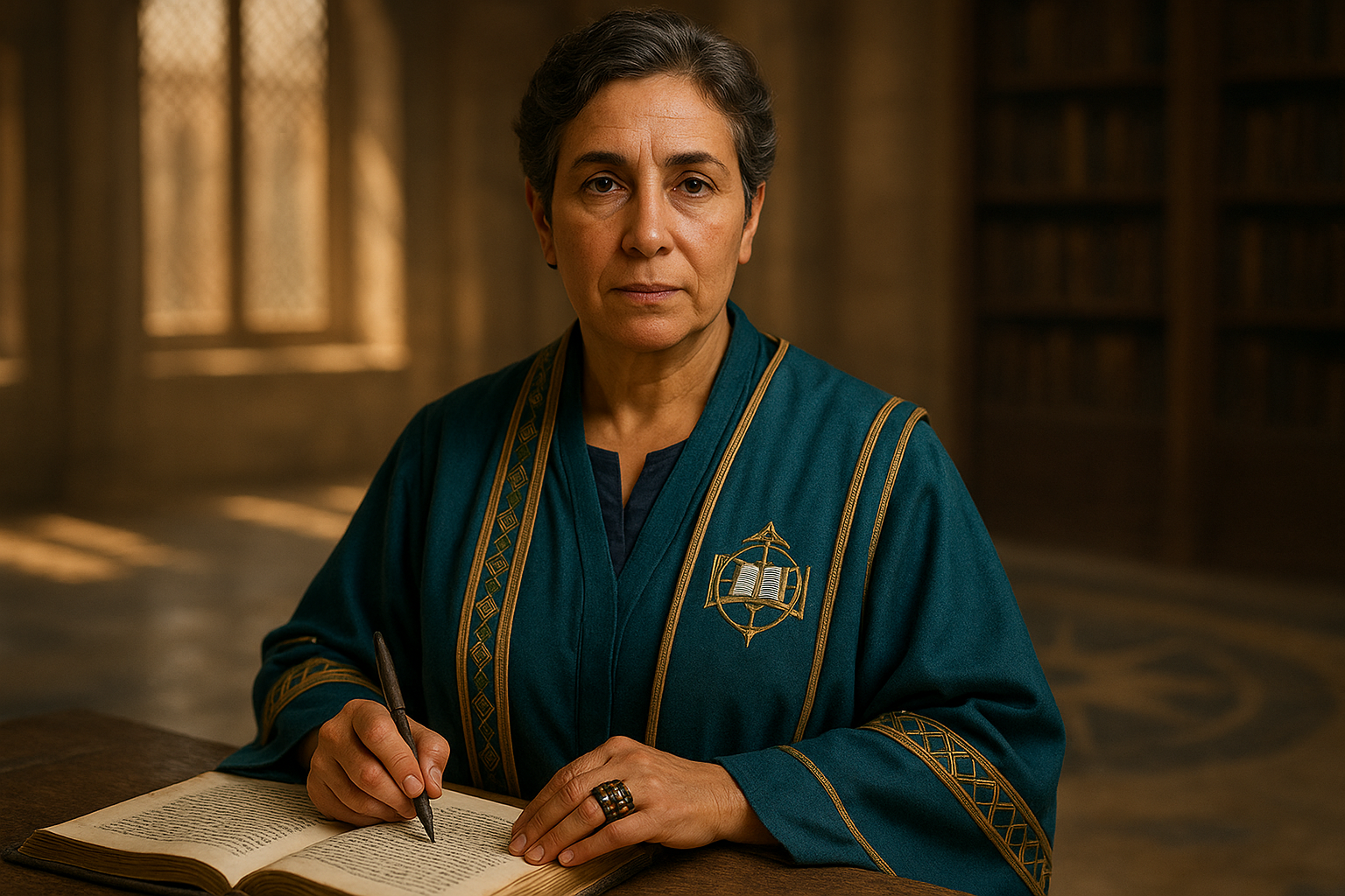 Austere teal robes edged in gold geometry; ink stains at the cuticles; a ring that serves as both personal seal and abacus counter. Her voice is measured, with the cadence of someone who expects to be quoted. When annoyed, she straightens ledgers until the columns align.