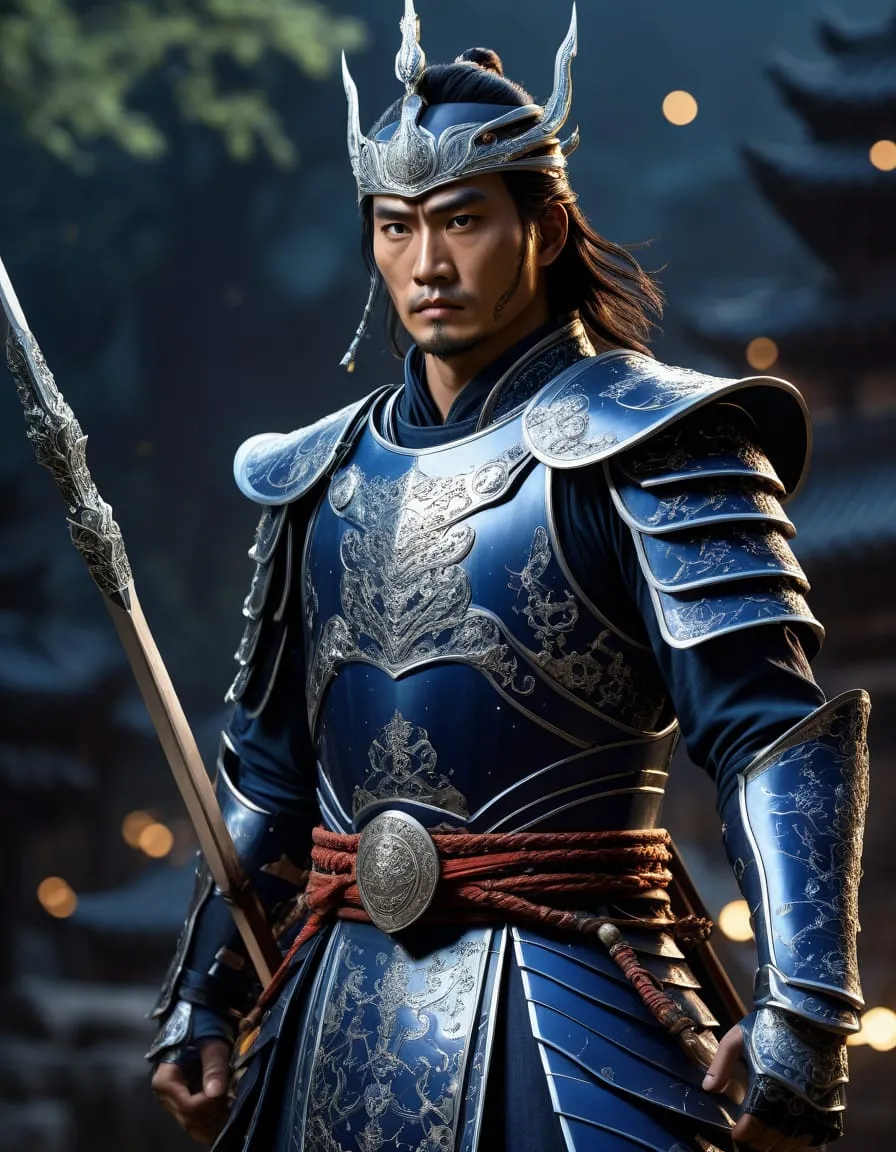 A tall, broad-shouldered man in his late twenties, Machin carries himself with a soldier’s bearing. He wears the ceremonial armor of the Imperial Guard — lacquered plates painted in midnight blue with silver constellations traced across them. His favored weapon, a long silver-shafted spear, is always at hand.