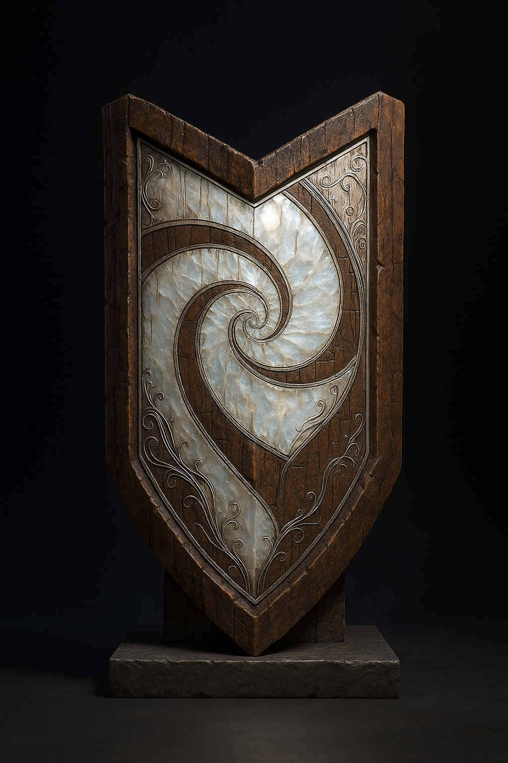 The Bulwark is believed to have been assembled from relic timbers dredged off the west coast of Rihsama and nacre harvested from ancient deep-shells. Its exact maker is unknown; the geometry and restraint suggest an artisan more concerned with function and survival than courtly display. The aesthetics of the depths —water and earth, pressure and gravity, song and stillness—are echoed perfectly in the piece.