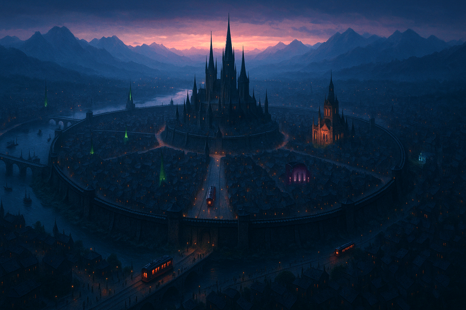 Bells toll ceaselessly. Black spires loom like candles of stone, their crimson glass alive with light. Choirs chant endlessly, hymns weaving into the city’s pulse.