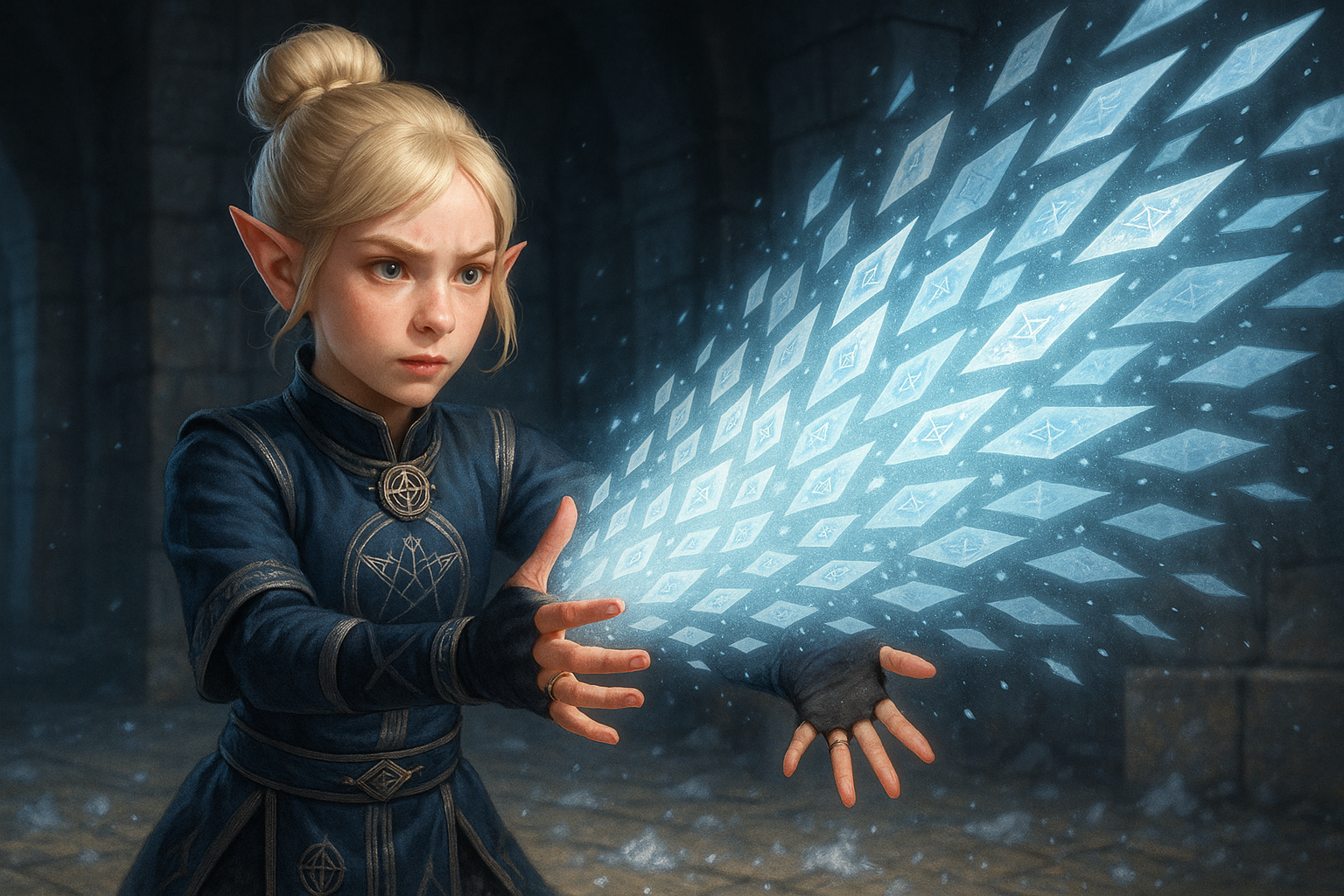 A squall of razor origami slashes outward. Creatures in the cone make a DEX save, taking 6d8 cold-radiant on a fail, or half on a success.