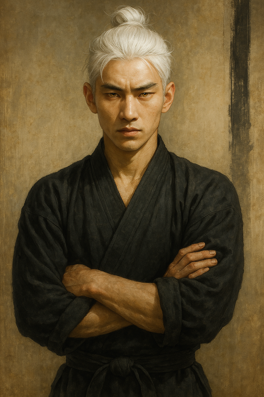 Appearance: Short, wiry, with scarred knuckles and calloused hands. His hair hair is white, a sign of purity in the family, tied up in a severe knot, and his golden eyes gleam with quiet intensity. He wears no ornaments, only the simple black garb of a duelist.