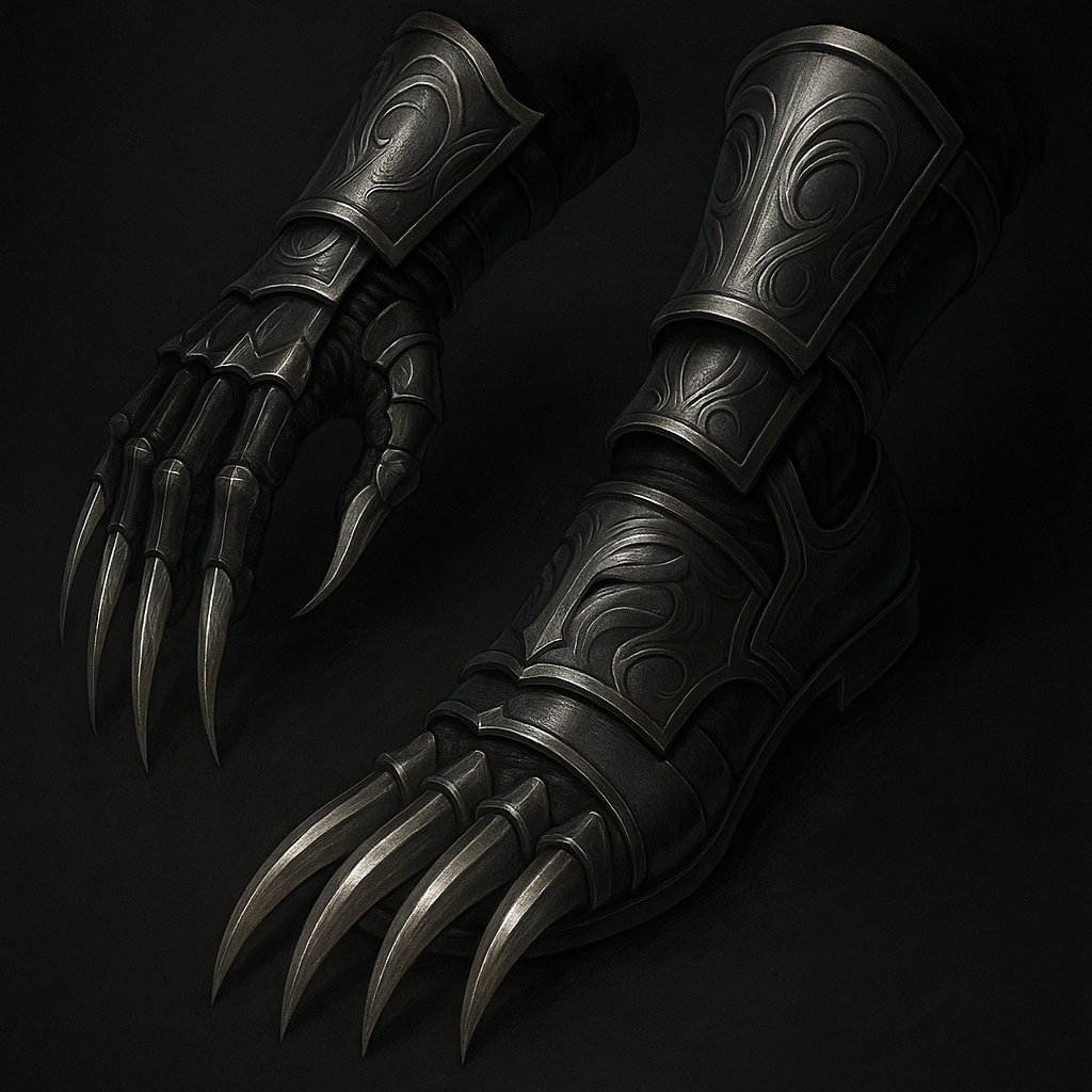 The claws whisper of the hunt. With them, a Shen warrior moves with impossible silence, striking from shadows where others could not tread. The gauntlets and sabatons heighten the wearer’s senses, gifting the clarity of scent and perfect sight in darkness. When upgraded, they blur the line between man and beast, allowing the wearer to move as an apex predator beyond the reach of prey — untrackable, relentless, and always advancing.