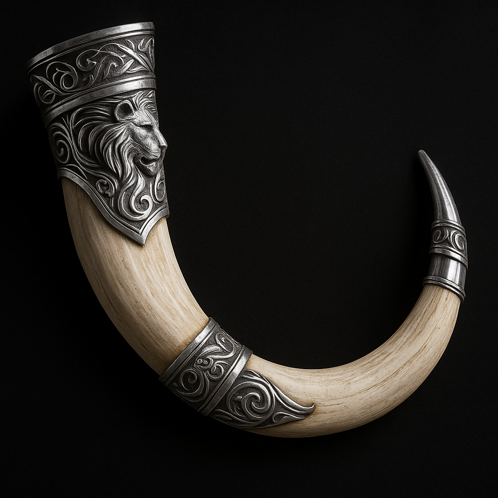 The Silver Roar is a war horn carved from the rib of the White Lion Founder, bound in silver and etched with the patterns of snow-laden winds. When sounded, its tone carries with unnatural force — like a lion’s roar rolling across mountains, impossible to ignore.