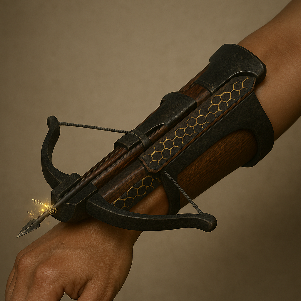 A compact hand crossbow carved from black Angstone and lacquered hardwood, inlaid with faint golden honeycomb patterns. The string appears woven from spider-silk but hums faintly with a bee’s drone when drawn. Bolts shimmer briefly with spectral bees crawling across their shafts before fading to shadow. When fired, they vanish into silence, leaving only the stillness of inevitability.