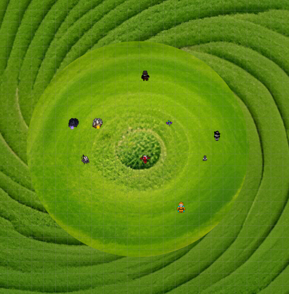- Action: The party awakens in a dirt field as grass and flowers spread into spiraling green hills around a central knoll. The mask of Edubeus' face remains on the hill, along with a single one of his glove hands.
