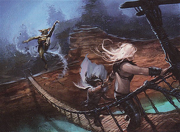 A moment's pause as the party catches their breath. The kobolds and their prisoners are gone: down the path beyond the bridge, even as H011-3 uses her wall of light to lob some last bolts of energy at their fleeing forms. The ropes of the bridge and Thais's mountain climbing gear creak as they sway in the breeze.