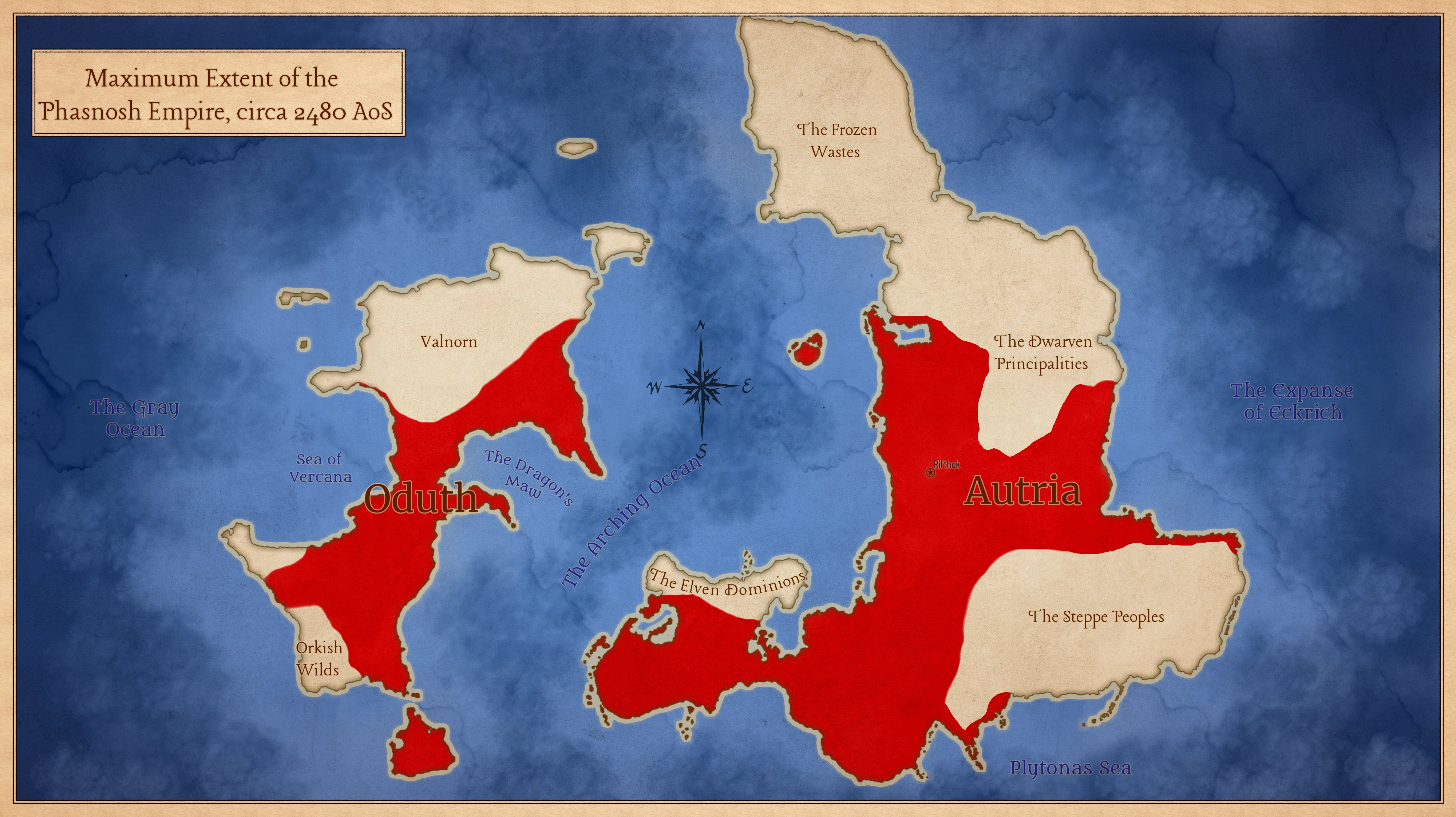 By 2480, the Phasnosh Empire reaches it maximum global extent. At its peak, it stretched across the continents of Autria and Oduth.