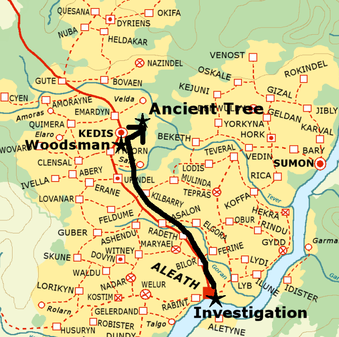 With several clues leading to Kedris, the party makes its way there. On the way, they discreetly ask fellow travelers if they have seen someone matching Silas’s description, but they have no luck.