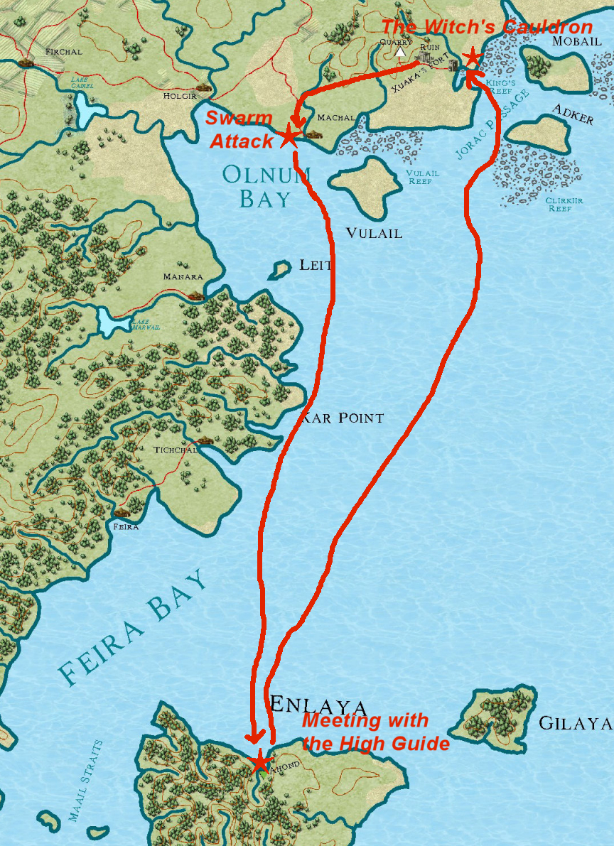 Kurok explains that these swarms follow in Obsidapor's wake, moving through the wreckage and devouring the dead. He suggests that the heroes consult the High Guide, or Holna. The High Guide is the spiritual leader of the coastal Adaenum Tribes, based on Enyala Island near the Alhond or Wilding place. The next day, Kurok takes them to an island by boat.