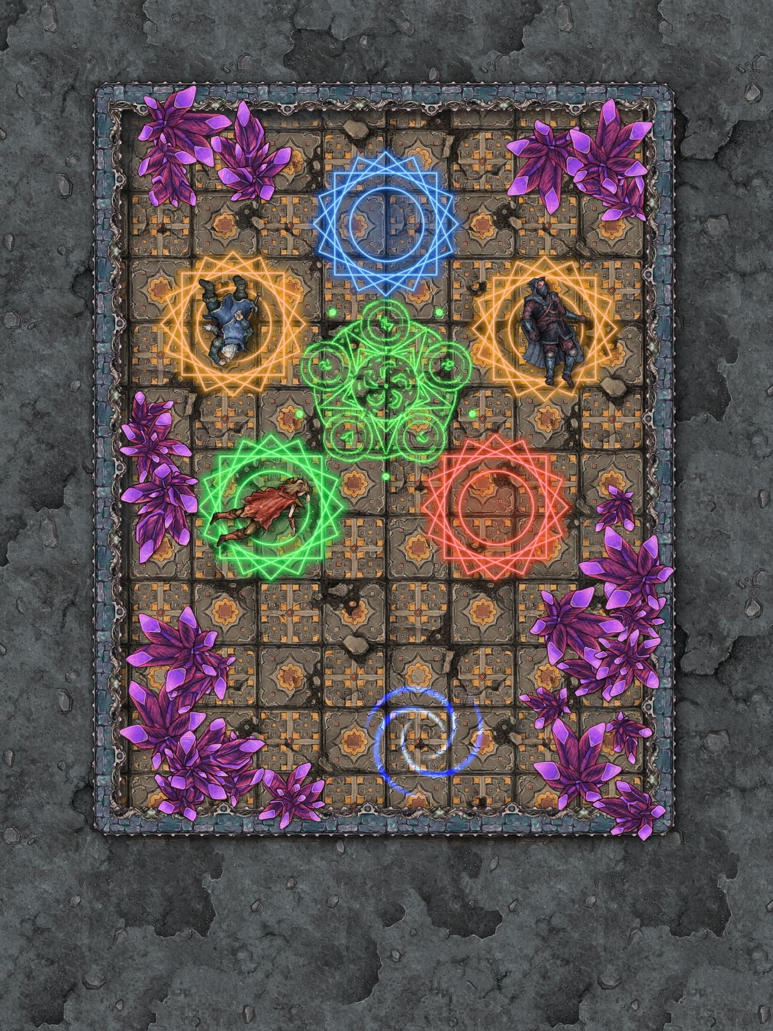 They open the next portal and go into a room bathed in in multicoloured light with strange purple crystals growing out of the walls. On the ground are five glowing runic circles with three corpses on the floor.