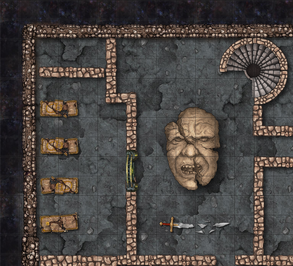 They see a portal open into a basement filled with broken cupboards and bookcases. In the corner is an iron bound chest with intricate lock which Suicu tries to open but it seems to resist his lock picking skills. Cautiously they creep down the corridor checking for traps but don't find any danger. Eventually they get into a large room with a stone face in the center, a bronze door with an inscription "Here lie the greatest heroes".