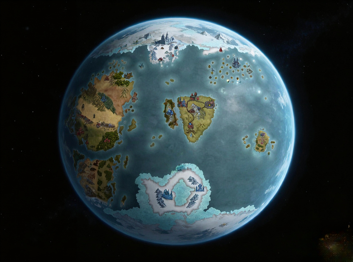 Elastar. A large continental island in the center of the world. Home to the The Empire of Mori, a technologically advanced society who transformed the continent with their machines and railroads.The Scattered Islands. Once a large continent but now an archipelago of many small islands. Its home to the Kingdom of Theresia, an ancient kingdom of Elves and magical creatures. They in magical ships and have created brilliant cities of marble and stone on the islands.