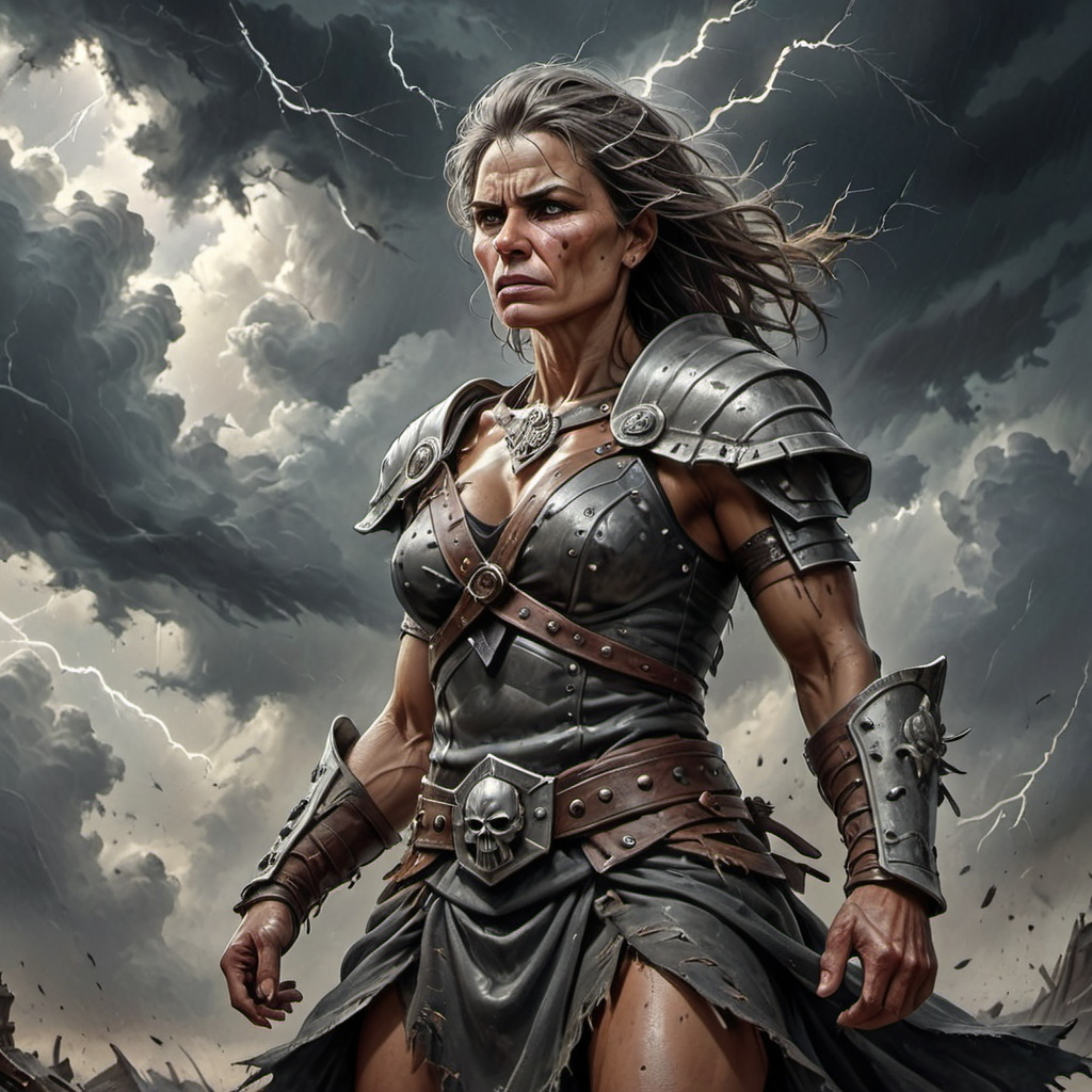 The Warlord send from Shadowstar Keep to lead an incursion into the lands of the Elves of Theresia. He is a Human from the tundra and hails from the city of Shadowstar Keep. An impressive warrior, ruthless, strong, aggressive and brave with a passionate hatred for magic and the Theresians. His name is Twice-Broken because he twice in life he was mortally wounded by an Evil beast he hunted in the tundra. He dresses in furs and has a half plate armor made from strange leather and metal plates. Wielding a jagged greataxe and a crude black powder pistol.