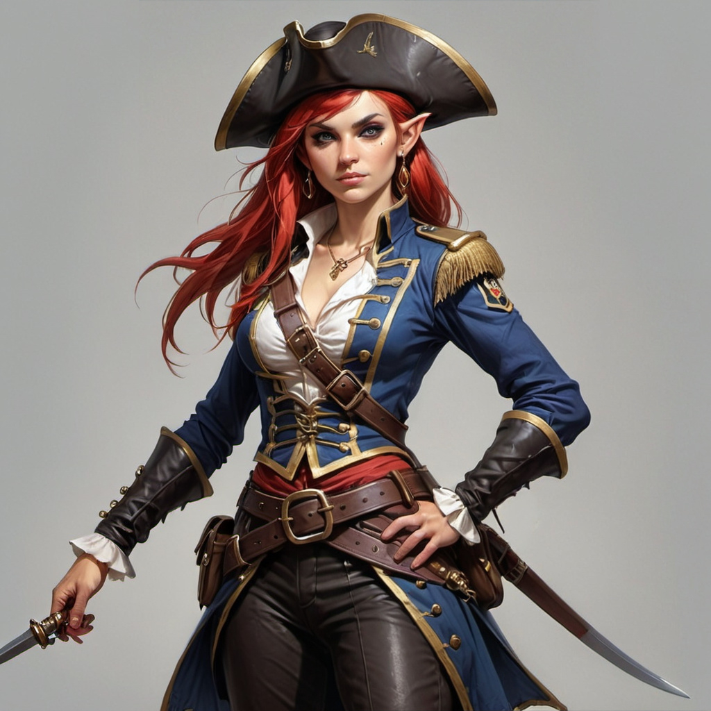 A Lathirian privateer captain who joined the cause for gold and glory! She's a Half-Elf and laidback for a ship's captain. One of her legs has been replaced with a prosthetic. She has a foul speech and is proud of her city Lathirian. Has bright red hair, a slim tall physique and wears leather armor and sailors clothing. Wields a nasty thin rapier. She captains the Waverider "Breath of the Maiden", a newly build sleek ship armed with ballistae.