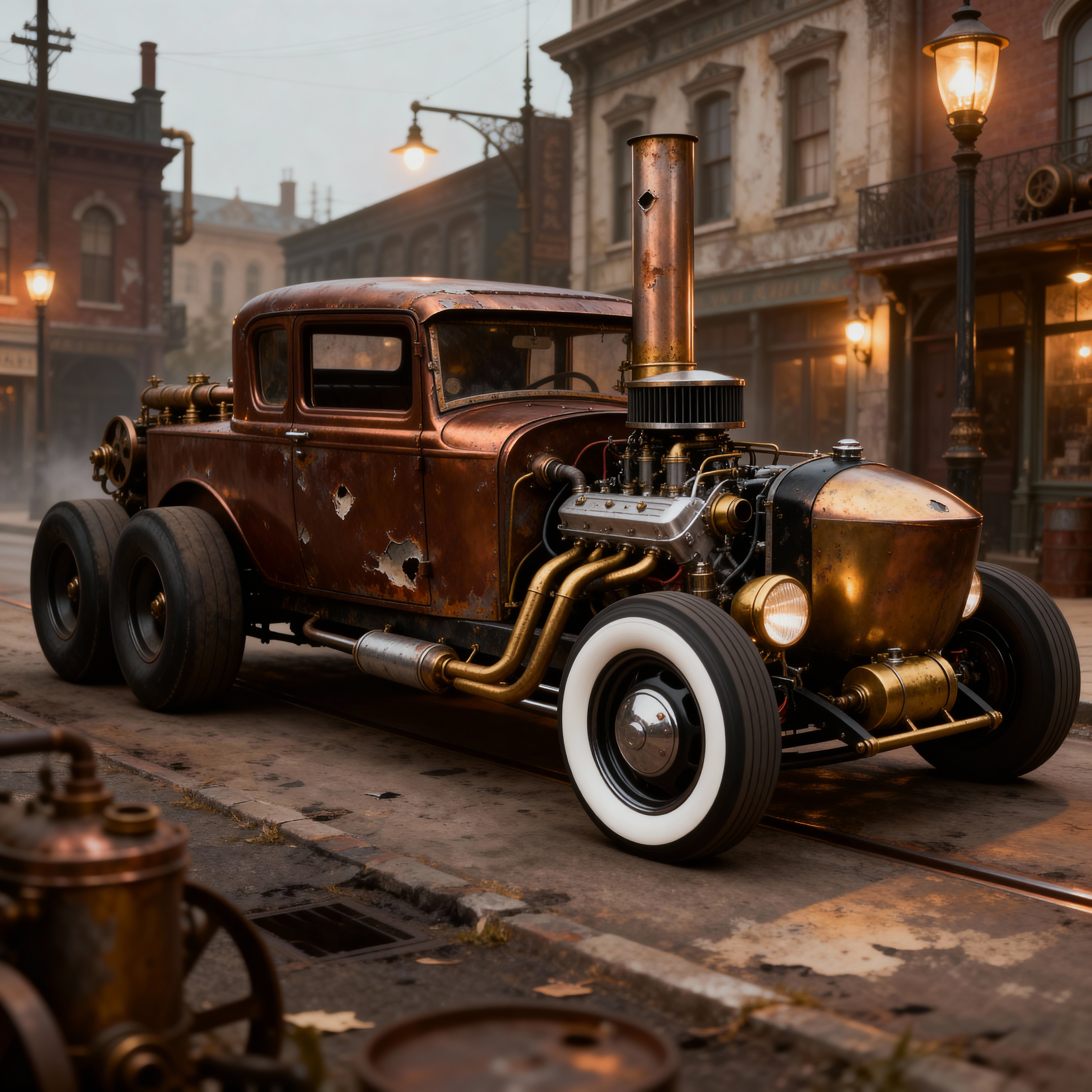 A brass, steel and wood automobile with six rubber wheels. The rear four provide power while the front wheels are used for steering.