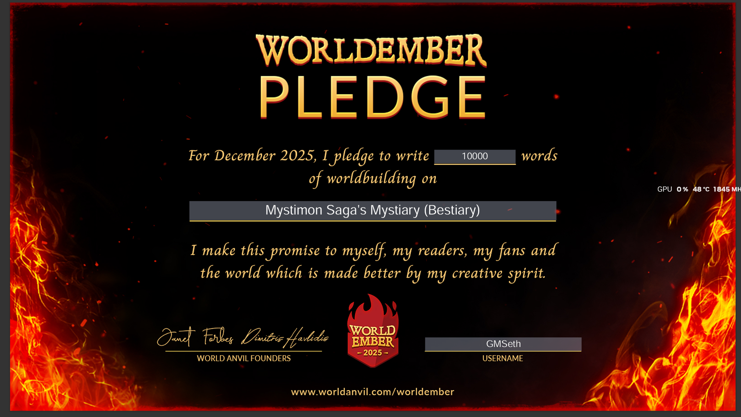 I pledge to write at least 10,000 words of worldbuilding on the Mystiary, what I call the bestiary of this world. I have archives of so many Mystimon that I have yet to get up on here and I plan to get that done over the course of December.