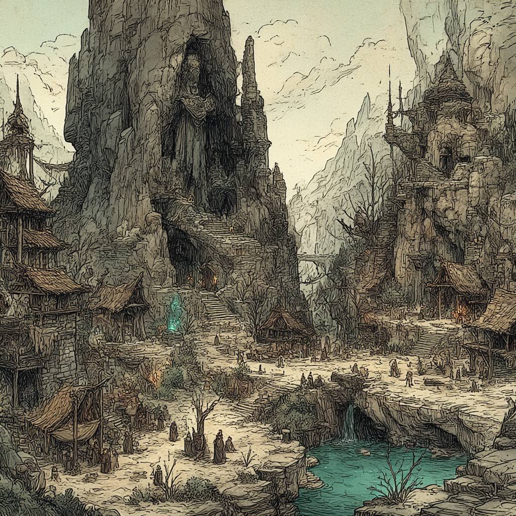 Aurelith is the home city of the Aurivane. It is a multi tiered city of wood and stone structures nestled near the base of a giant stone statue set into an alcove of the nearby cliffside. A great library vault, the largest in the known world, is built into the cliffside beneath the stone statue. A river runs happily through the lower levels of the valley creating the need for many bridges along its path.