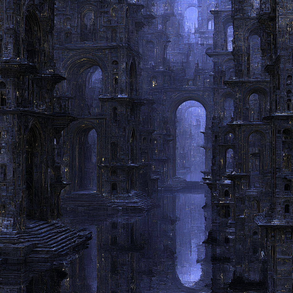 The city is quiet by day, but at night it glows with soft lavender and deep-blue reflections, fed by bioluminescent minerals woven into its stonework. Pools and canals act as lenses, doubling and tripling the cityscape in shifting liquid reflections. Outsiders describe the place as “dreamlike, slippery, and unnerving,” a city where truth feels thin and reality flickers around the edges.