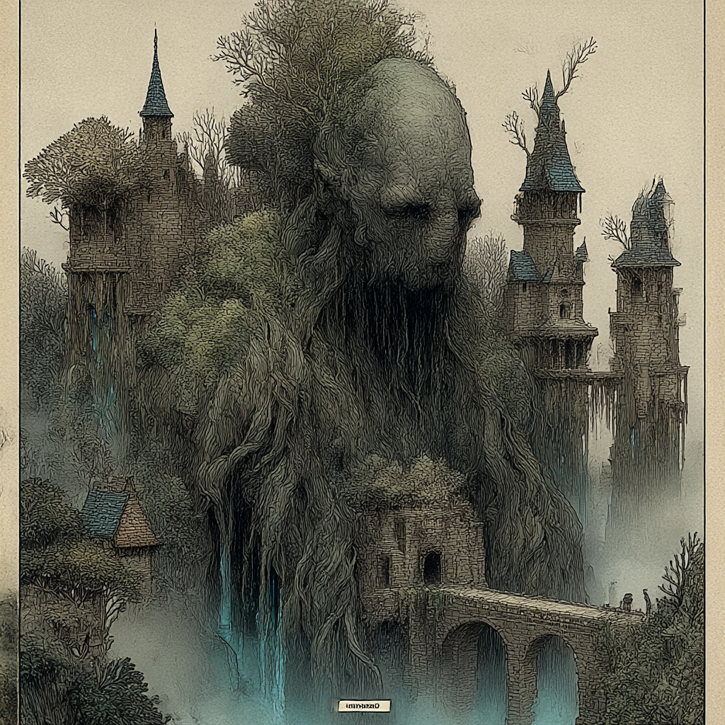 At the city’s heart, the statue's face lies serene beneath layers of soil and bloom, its closed eyes forming two vast basins where gardens of healing flourish. The Children believe that as long as the titan dreams, the forest itself will remember every life it shelters.