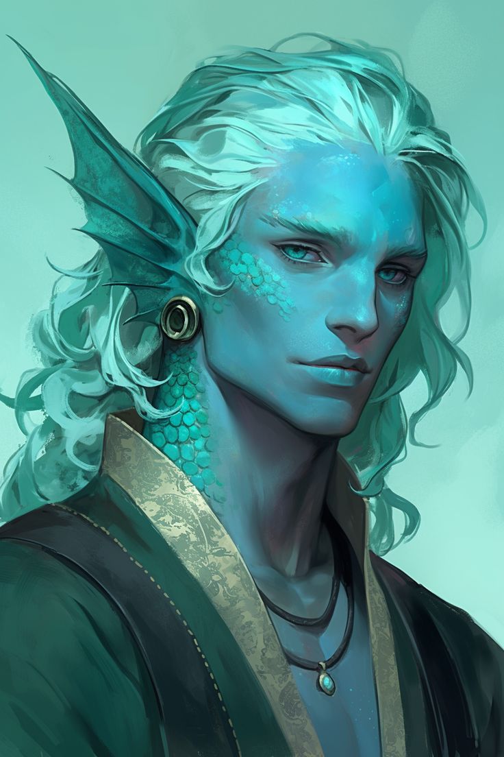 The scaled ridges along his temples and the delicate fin-like protrusions behind his ears mark his Virellian lineage. His left ear bears a golden ring engraved with runes—a sigil of office binding his loyalty to the crown (a magical geas he’s begun to quietly seek a way to undo).