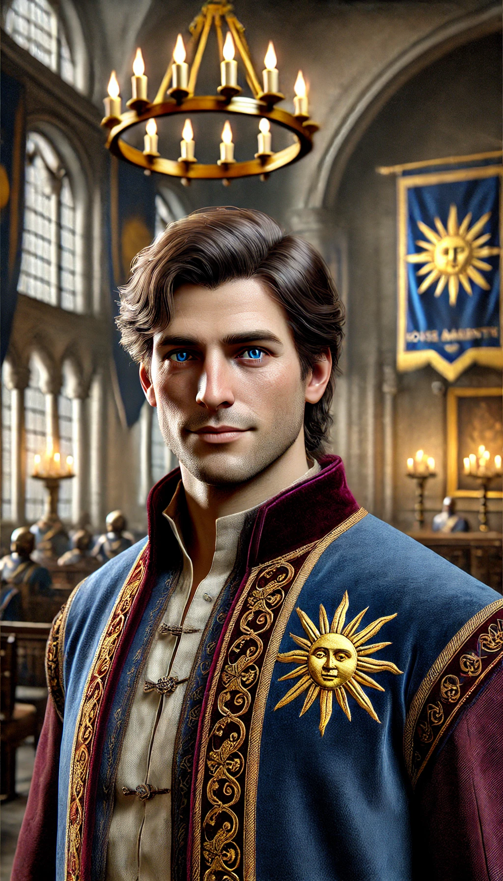 Description et apparence. Âgé de 38 ans, Arvenor Alamontyr est le second fils du Roi Karodas Alamontyr et de la reine Maerynna Alamontyr. Moins martial que son frère aîné Maerion Alamontyr, il s’est forgé une réputation non pas sur les champs de bataille, mais dans les salles du pouvoir. De stature moyenne, élancé mais robuste, Arvenor possède un visage fin, adouci par un sourire mesuré et un regard bleu clair empreint de sagacité. Ses cheveux bruns sombres, soigneusement coiffés, commencent à se parsemer de mèches argentées, ce qui renforce son allure de diplomate accompli. Il est toujours vêtu avec élégance : manteaux de velours aux couleurs de la dynastie, brodés du soleil levant doré des Alamontyr.