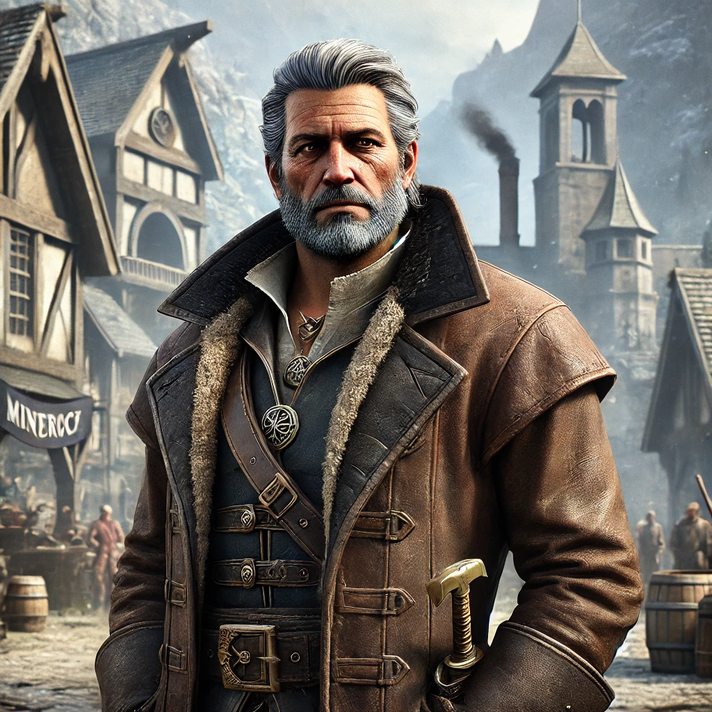 le Bourgmestre Borlan Graveroche est un homme robuste, au visage buriné par les années passées à travailler le fer et à arpenter les mines de Mont Rochefer. Ses cheveux gris-argent, toujours impeccablement peignés en arrière, contrastent avec ses sourcils épais et noirs. Une cicatrice discrète traverse son front, souvenir d’un éboulement lors de ses jeunes années en tant que mineur. Ses yeux perçants, d’un gris acier, semblent toujours jauger les personnes et les situations avec un mélange de dureté et de pragmatisme.