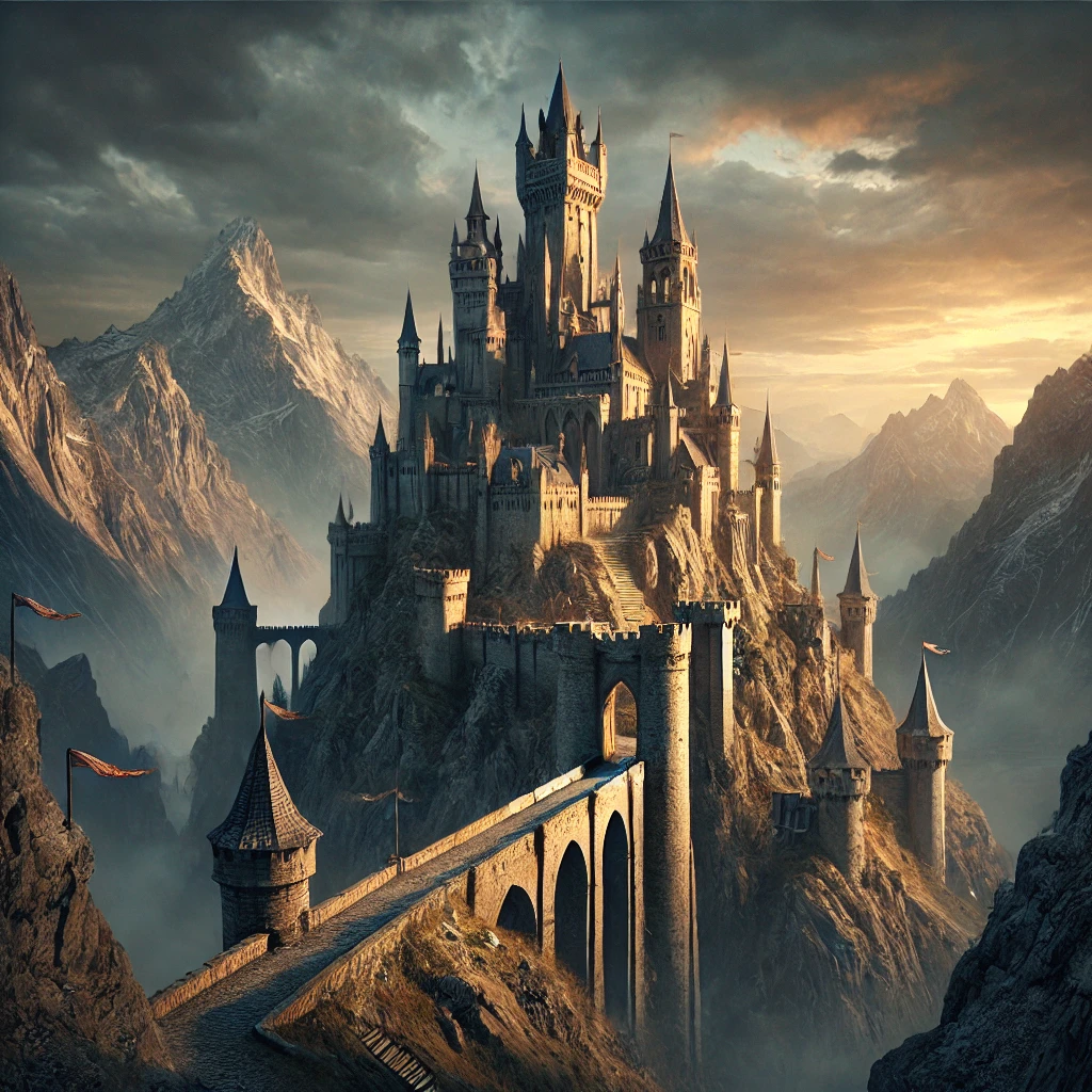 Le Château de Kiergard est un chef-d'œuvre d'ingénierie médiévale, conçu pour la défense autant que pour impressionner. Ses murs d’enceinte massifs, taillés dans la pierre locale sombre, sont renforcés par des tours de guet imposantes équipées de balistes et de catapultes. Le donjon central, une structure imposante au cœur du château, s’élève comme un symbole de la puissance de la famille Kiergard. Des escaliers escarpés mènent à l’entrée principale, protégée par une double herse, des douves profondes, et des ponts-levis. À l'intérieur, des cours spacieuses sont bordées de casernes, de forges, d’étables et de garnisons, tandis que des jardins intérieurs dissimulés offrent des espaces de sérénité au sein de cette grande forteresse.