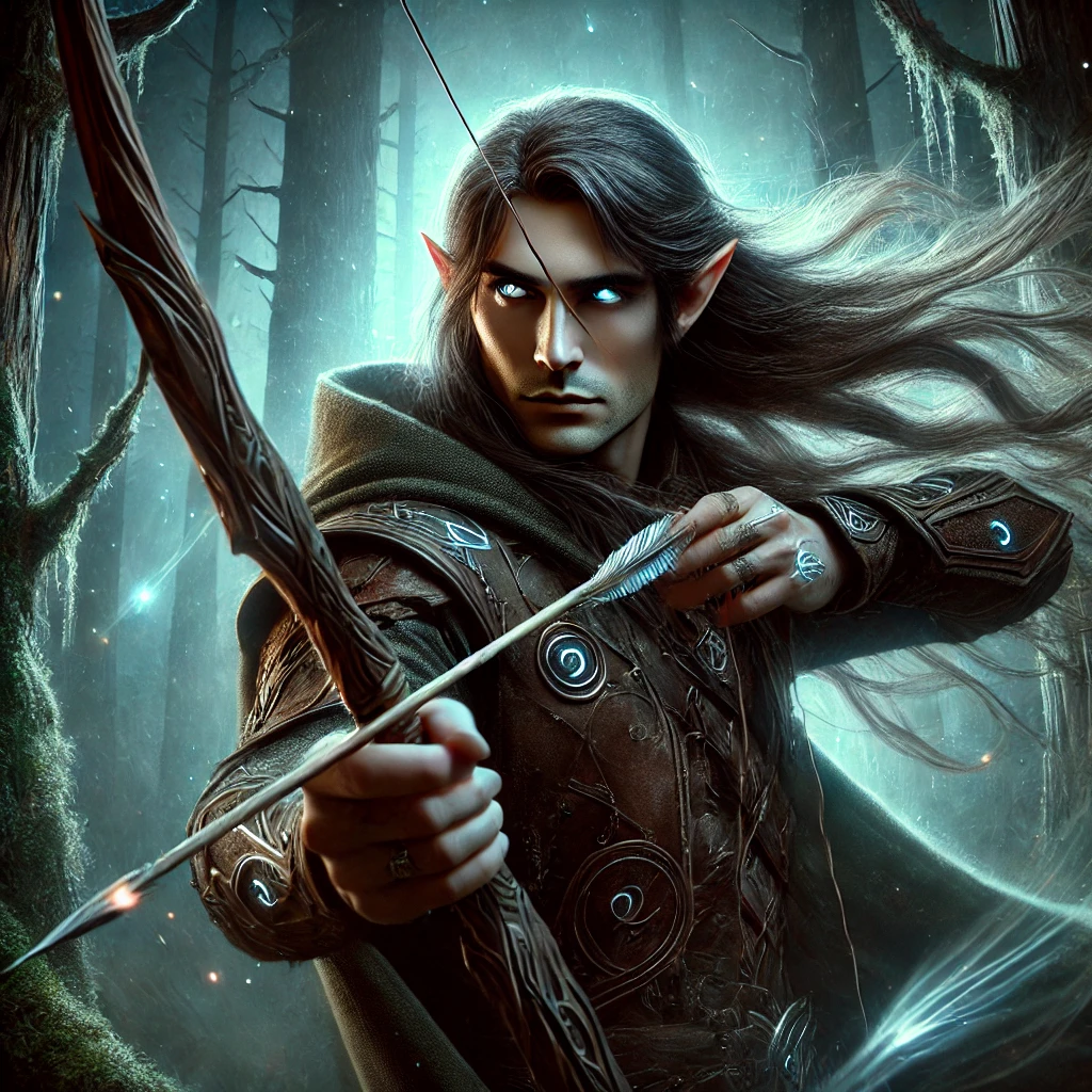 Description et Apparence. Corvanyr est un elfe à la présence énigmatique et marquée par la rudesse de la vie sylvestre. De haute stature, élancé et musculeux, il incarne à la fois la grâce elfique et la robustesse du chasseur. Ses cheveux longs, d’un brun sombre strié de mèches argentées, tombent librement autour d’un visage sévère. Ses yeux gris sombre, presque noirs, semblent sonder les ombres et percer les secrets de la forêt. Il porte généralement une armure de cuir souple renforcée de plaques de bois vivant enchanté, adaptée pour la furtivité et la survie. Sa cape, tissée à partir des feuillages enchantés de la Vieille Forêt, se fond dans l’environnement, rendant ses déplacements quasi invisibles. Son arc, Lunombre, est une arme légendaire forgée à partir d’un bois ancien mêlé à des éclats de météorite, réputée pour ne jamais manquer sa cible.